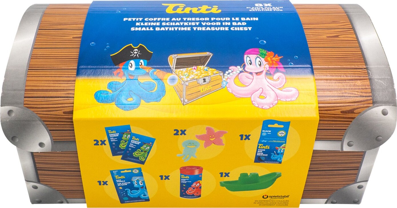Gør badetid sjovere med Tinti Skattekiste Med Badelegetøj. Denne fantastiske skattekiste indeholder 8 dele, der er designet til at engagere og underholde dit barn, mens de lærer om farver, former og kreativ leg.