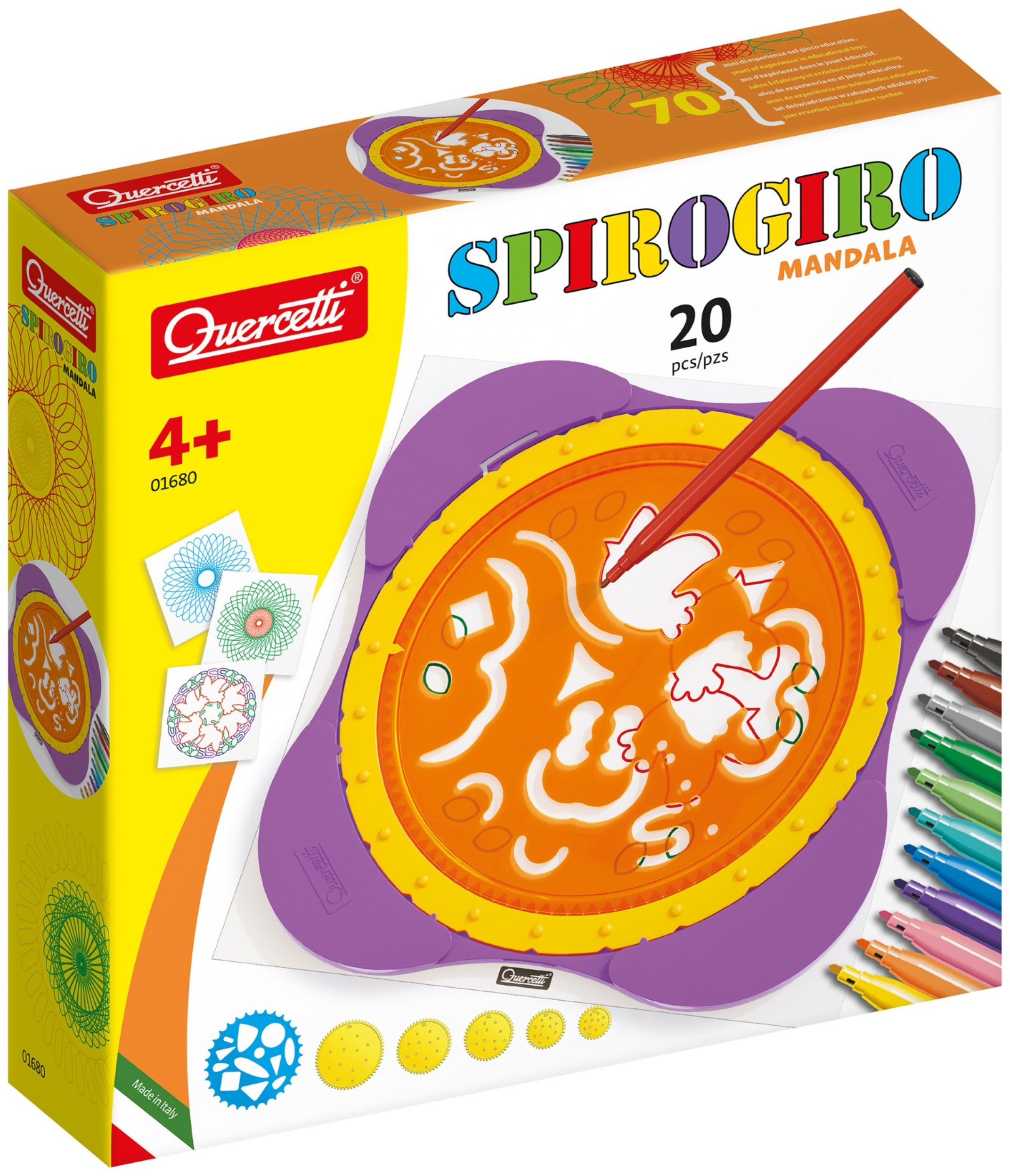 Spirogiro mandala malesæt fra Quercetti. Perfekt til kreative stunder. - Indeholder: 12 tegnepapirer, 12 farveblyanter, 1 spirograf, 7 tandhjul, 1 brugsvejledning. - Farvelæg og lav mønstre. - CE-mærket. - Anbefalet alder: Fra 4 år. - Papir, plastik.