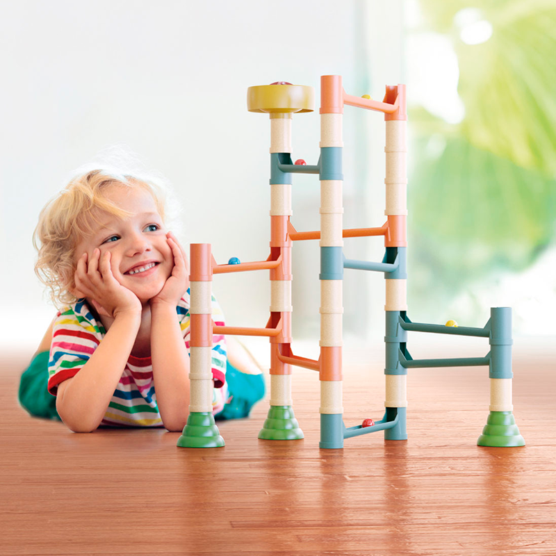 Efterlign kuglebanen på æsken eller find på jeres egne konstruktioner og lad kuglerne trille over broer og ned gennem rør.Af en plast som er blandet med 40 % træmasse.Robuste og brudsikre dele.Delene kan vaskes med en fugtig klud men tåler ikke at blive sænket ned i vand.