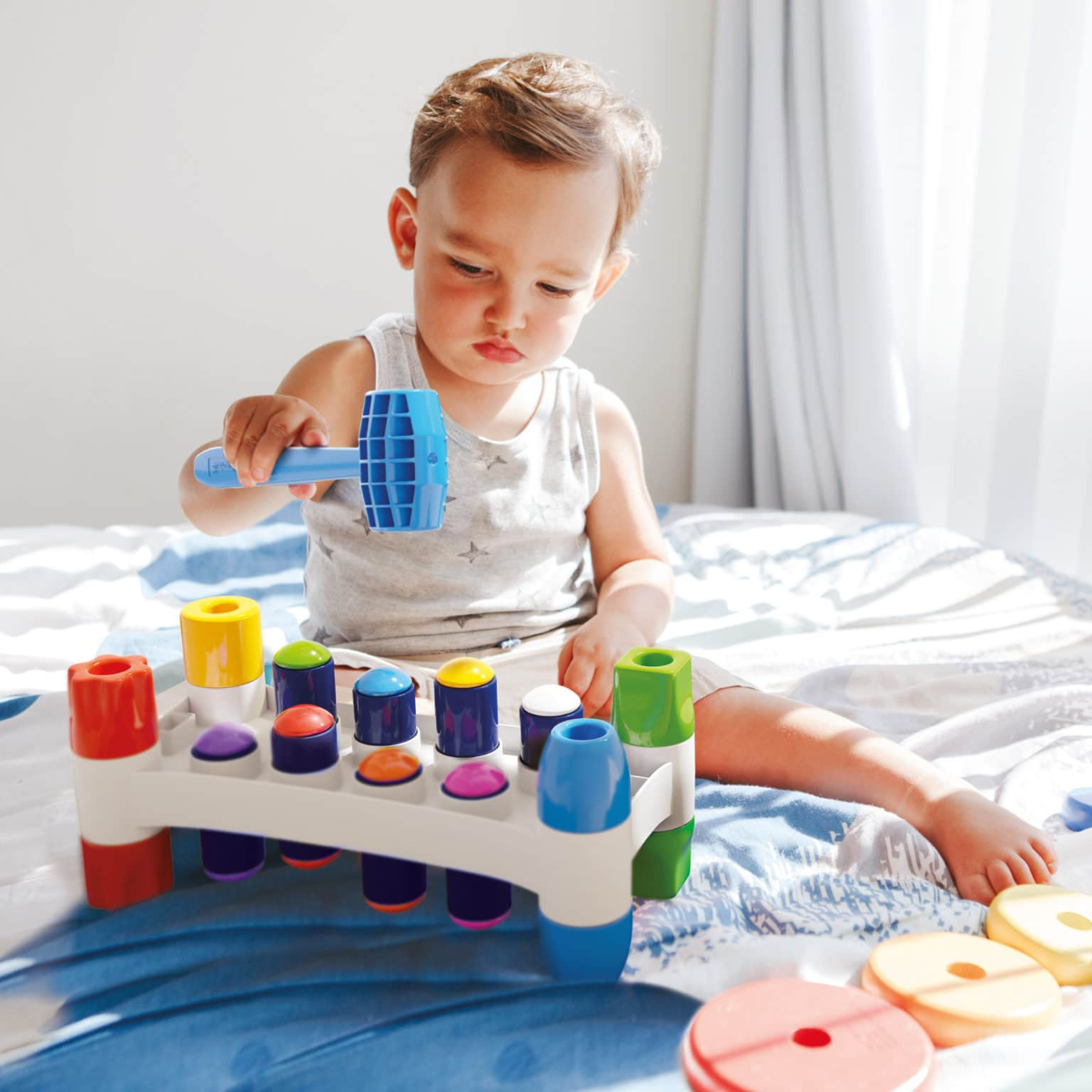 Bonk bonk. Et hammerbręt er lidt af en klassiker blandt legetųj til tumlinger, og det er da også bare herligt at få lov til at banke plųkkerne ned med hammeren. Du kan vęlge at hęve bręttet, så det er muligt at få plųkkerne helt gennem stativet. Pakken vejer 970 gram.Rengųres med en fugtig klud med lidt rengųringsmiddel.