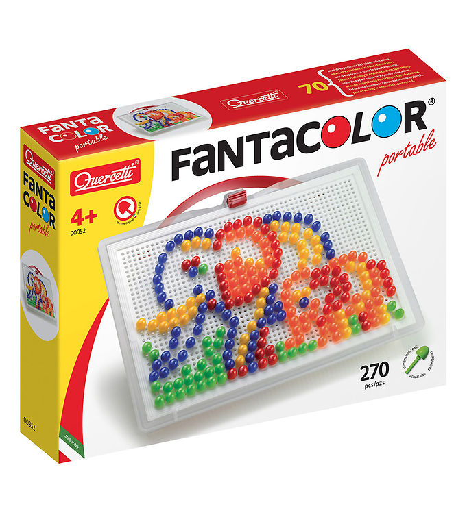 Quercetti Stiftmosaik - FantaColor er det perfekte sæt til kreative sjæle, der elsker at lave farverige mosaikker. Med hele 270 dele tilbyder dette produkt uendelige muligheder for at skabe smukke billeder og designs. Hver del er nem at håndtere og kan let sættes sammen, hvilket gør det ideelt til både børn og voksne.