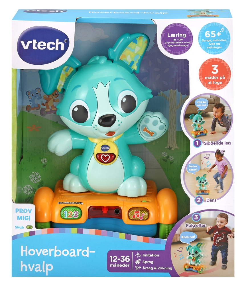 Vtech Baby Hoverboard Hvalp styrker barnets motoriske udvikling, da den søde hvalp på hoverboard kører rundt og motiverer barnet til at lege med og følge efter sig. Dette legetøj til førskolebørn har sensorer, som registrerer, når forhindringer eller barn