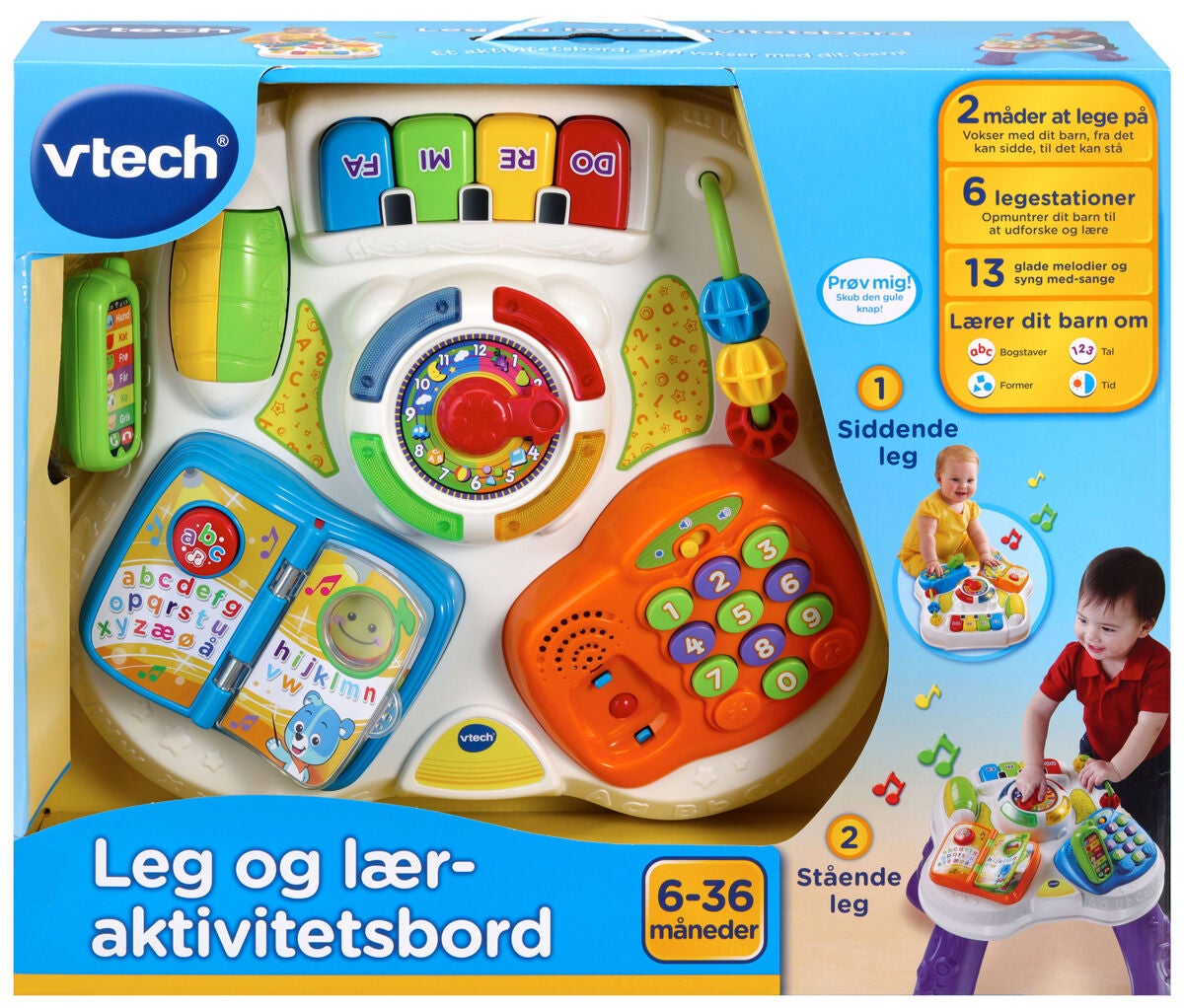 Aktivitetsbord fra Vtech. Med dette bord lærer dit barn om bogstaver, tal, former og tid. Det har 13 glade melodier og syng med-sange, og 6 forskellige legestationer der opfordrer til at udforske og lære. Bordet udvikler motorik, koordination og problemløsning. Bordet kan bruges med eller uden benene, så man kan både lege med det stående og siddende op gulvet. Anbefalet alder: Fra 6 måneder.