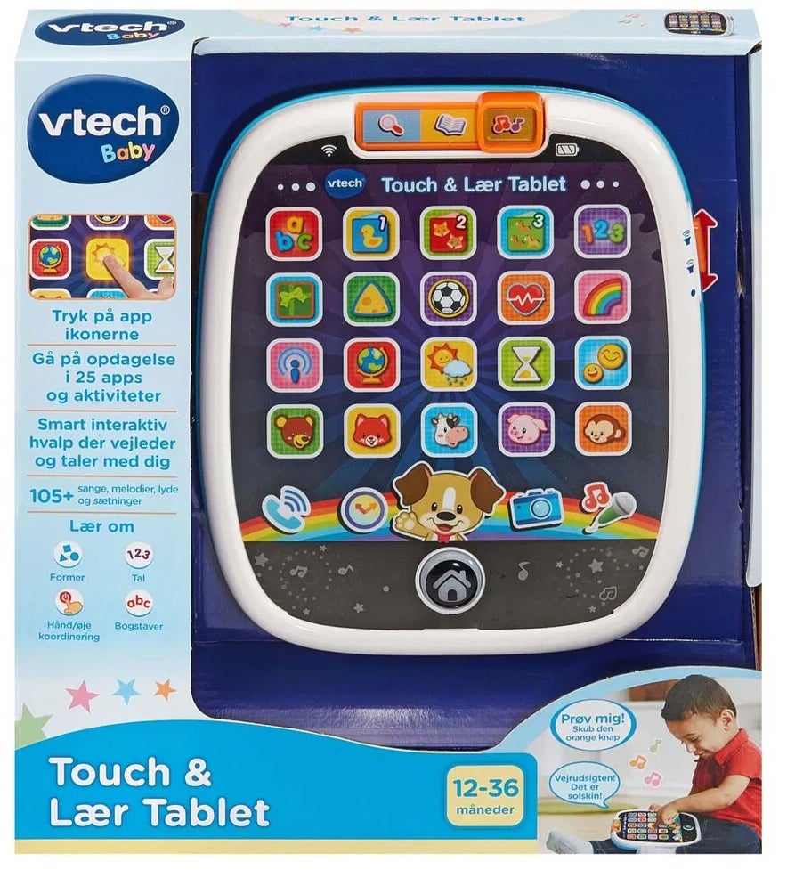 Tablet-PC fra Vtech med mange sjove funktioner. Perfekt til pædagogiske og lærerige lege! - 25 app-knapper. - 3 legetilstande: Udforsk, Musik og Lær. - Over 105 sange, melodier, lyde og fraser. - 3 sange man kan synge med på. - Sjove lysmønstre. - Lær om tal, former, dyr, farver, bogstaver og meget mere. - Fremmer barnets finmotorik og sprogudvikling. - CE-mærket. - Anbefalet alder: Fra 12 måneder. - Plastik. - Batterier medfølger.