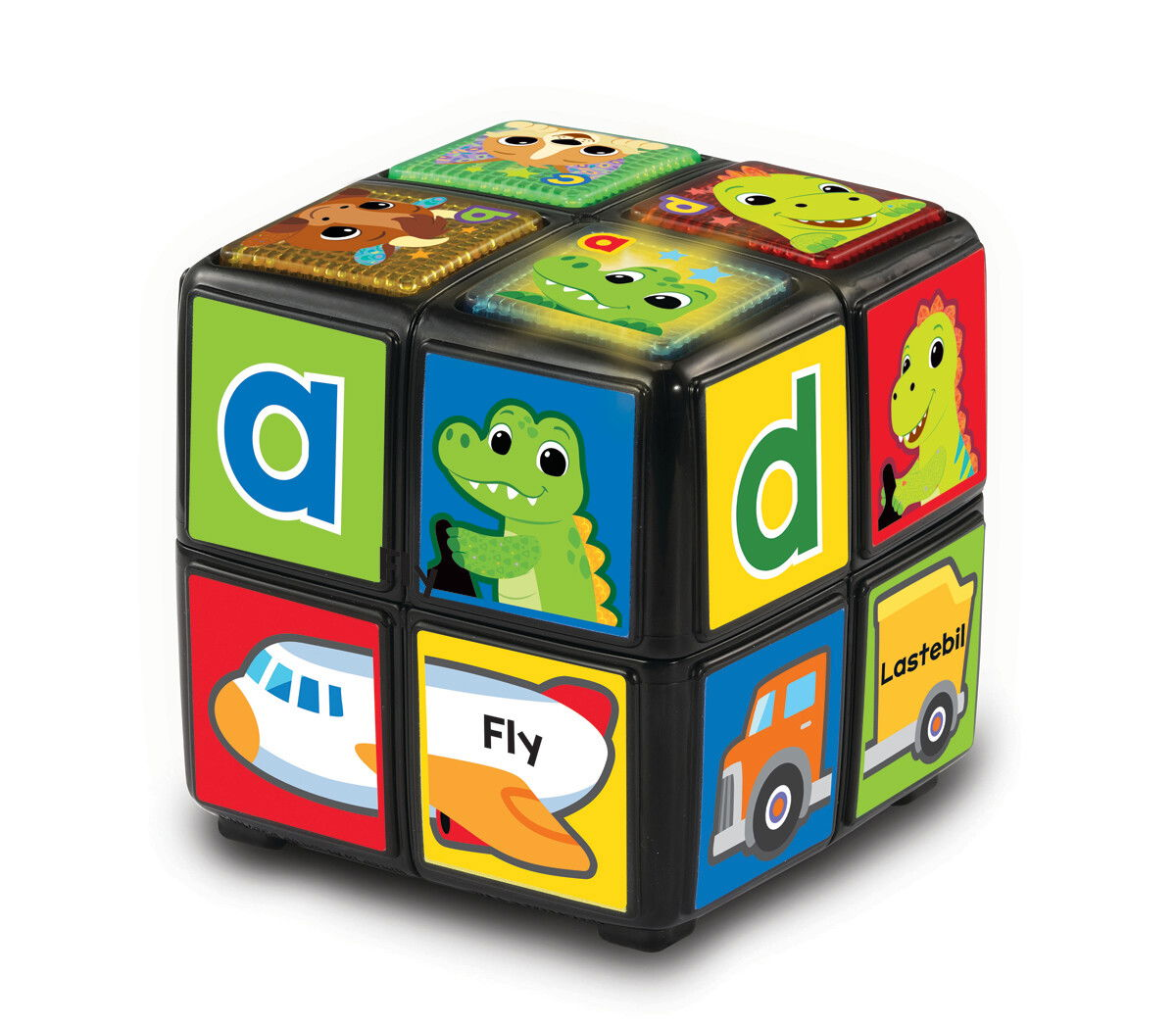 En professorterning kan få mange til at miste tålmodigheden, men denne er designet så der ikke er noget rigtigt eller forkert, når dit barn tvister rundt på dyr, bogstaver og transportmidler (fly, båd, skraldevogn og bil). Inklusiv 2 AA-batterier som får terningen til at kunne lyse og sige navnene på dyrene, farverne og bogstaverne.Vælg om du vil have professorterningen med lyde på dansk, svensk eller norsk.