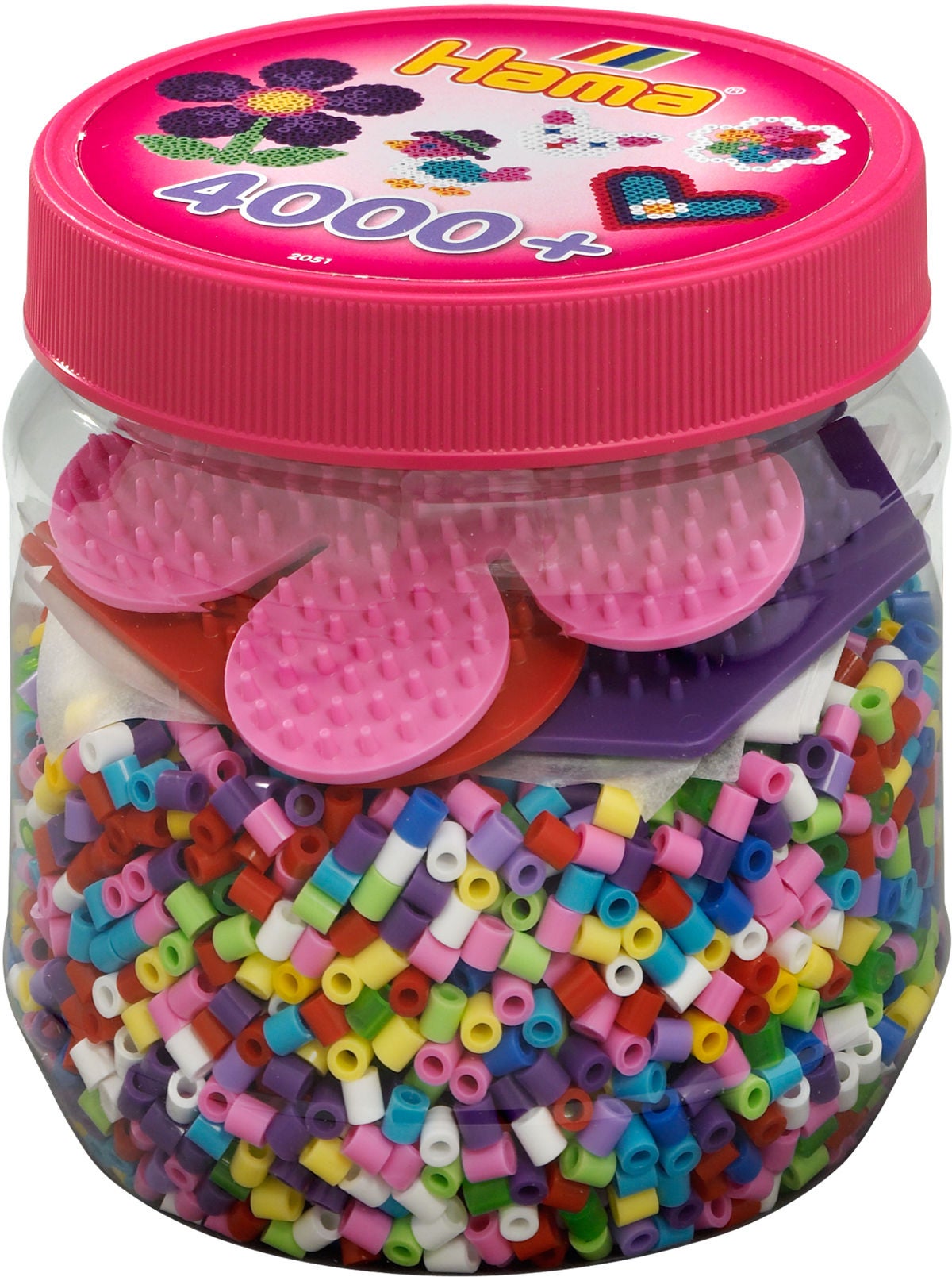 Dåse fyldt med hele 4000 perler fra Hama. Perlerne har klare nuancer. Der medfølger 3 små perleplader (blomst, hjerte og en sekskant) samt strygepapir. Med dette sæt kan du lave hvad som helst i perler kun fantasien sætter grænser! Anbefalet alder: Fra 5 år.