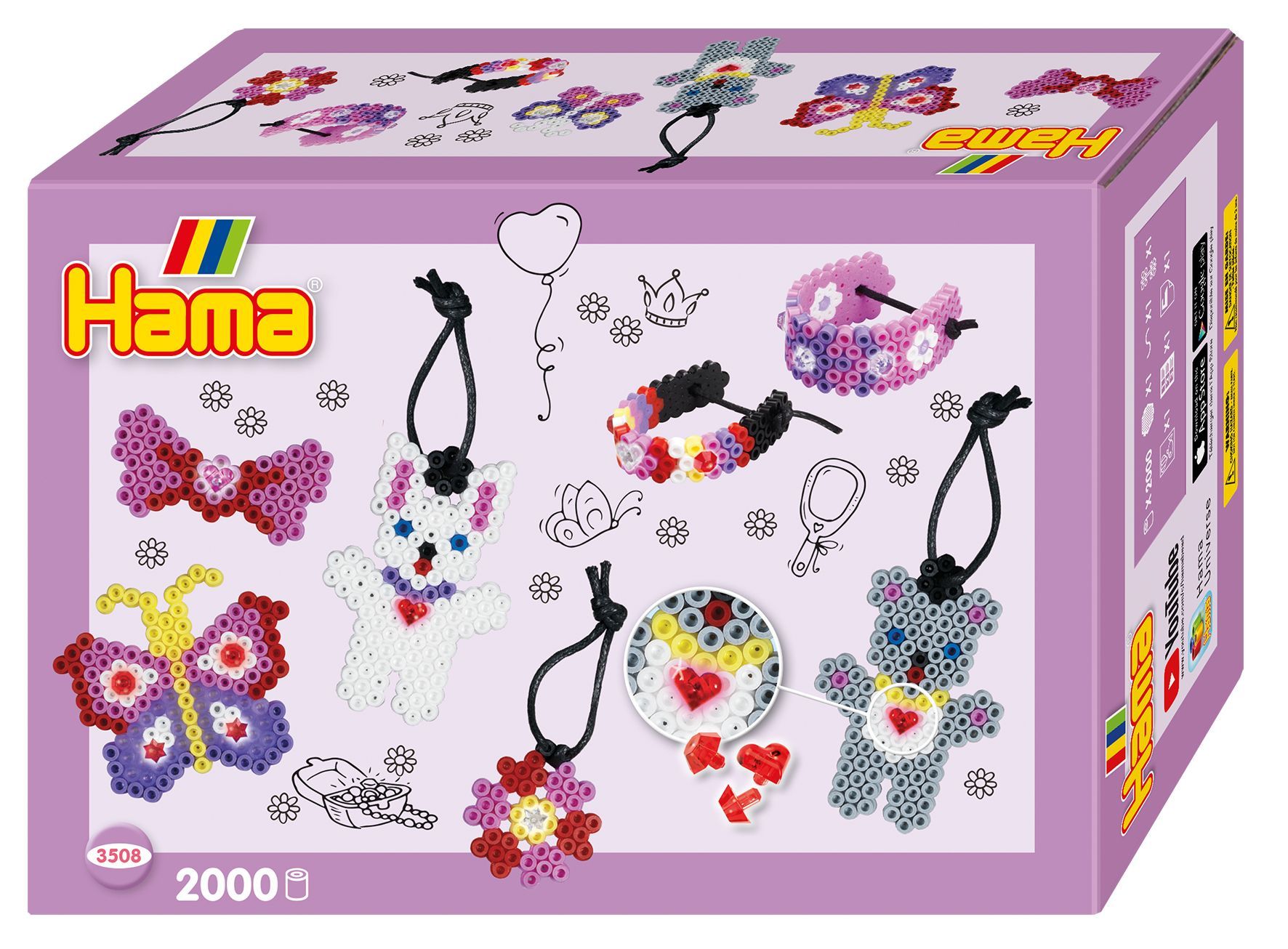 Gaveæske med et perlesæt fra Hama. Sættet indeholder 2.000 perler, 1 sekskantet perleplade, voksbehandlet bomuldssnor, 2 Hama-ædelsten samt instruktioner og strygepapir. Skab en masse flotte smykker, mønstre og figurer. Kun fantasien sætter grænser. At lege med perler udvikler kreativitet, finmotorik, mønster- og farvelære, logik og følelsen for geometri. Anbefalet alder: Fra 5 år.