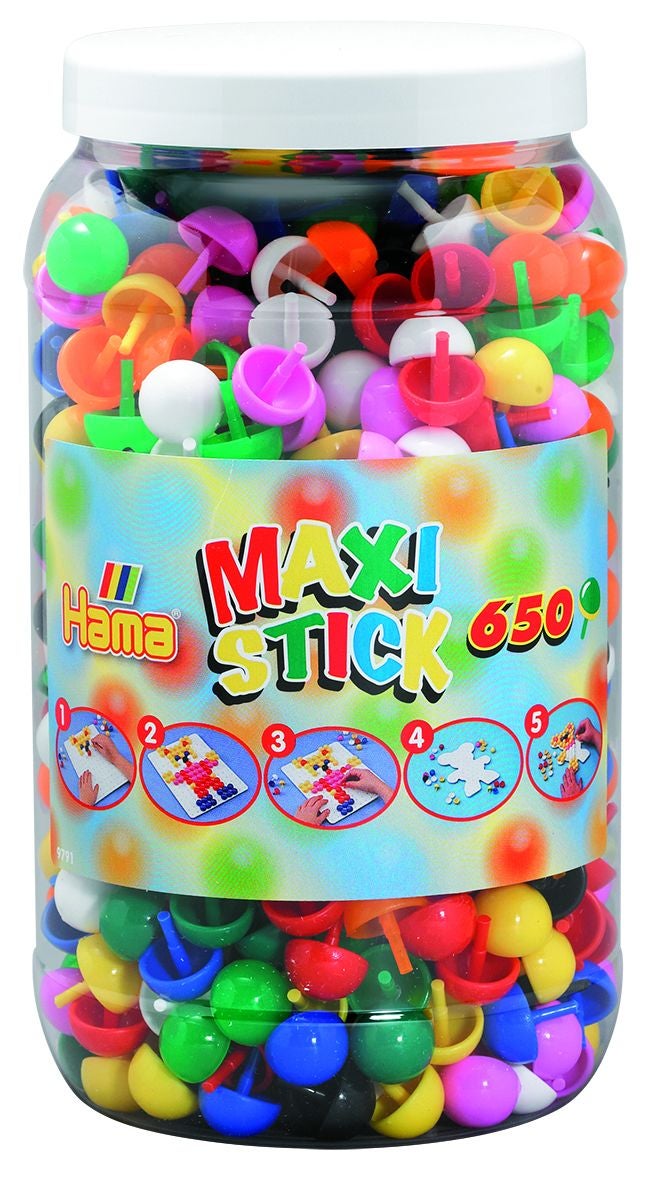 Stor bøtte med Maxi Sticks fra Hama. Bøtten indeholder 650 Maxi stift-perler i 9 forskellige farver. Perlerne er store og lette at få fat i, så selv små fingre kan skabe flotte mønstre og motiver. De kan let sættes på en hulplade og flyttes rundt igen. Kun fantasien sætter grænser for kreativiteten. Hulplade medfølger ikke, sælges separat. Anbefalet alder: Fra 3 år.