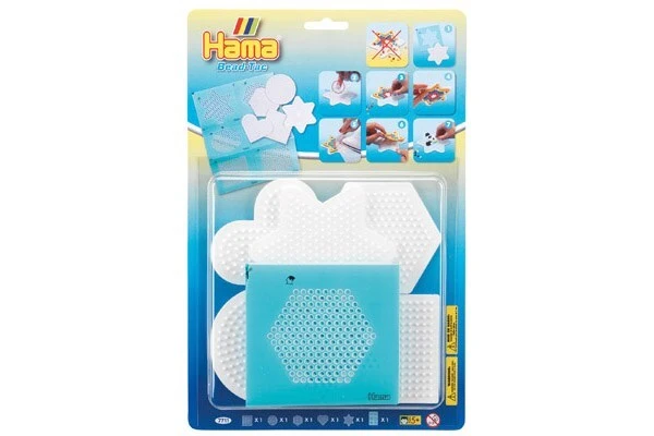 Stiftplader til Hama perler. Stiftpladerne fåes både som formstøbte firgurer og plader, hvor man kan lave sine egne mønstre og motiver.