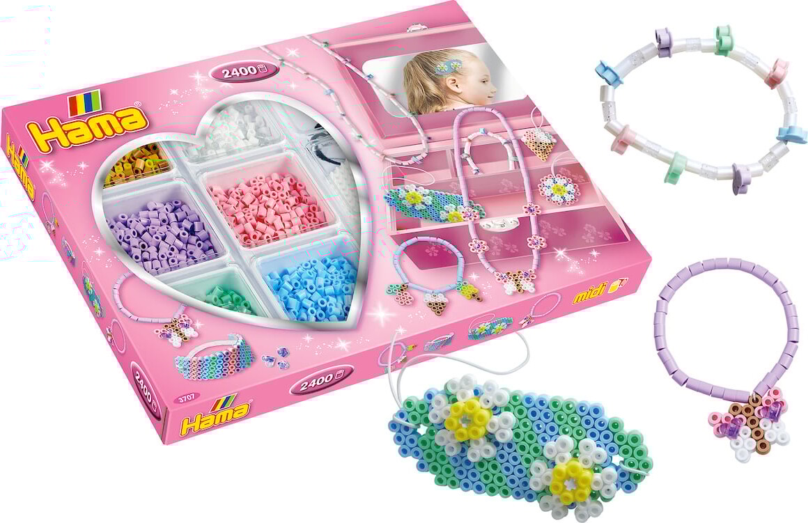 Skab farverige og unikke designs med Hama Midi Perler. Denne pakke indeholder hele 2.400 perler i en smuk pink farve, der vil inspirere til timevis af kreativitet og leg. Perlerne leveres i en praktisk opbevaringsboks, som gør det nemt at holde styr på dem, så du altid kan finde de perler, du skal bruge.