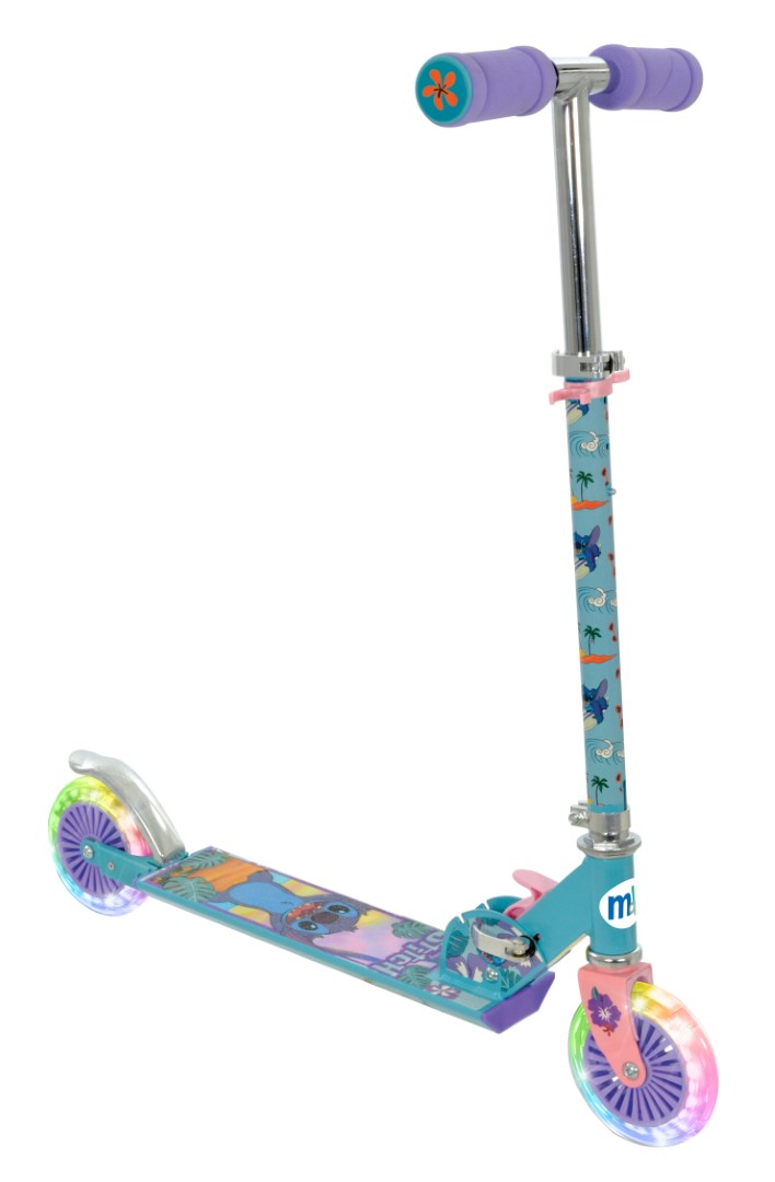 Gør dig klar til at rulle med Stitch sammenklappelig løbehjul med lysende hjul, den ultimative tur for eventyrlystne sjæle! Officielt licenseret og med karaktergrafik, skridsikkert dæk og fuldt indpakket styr, er dette løbehjul både stilfuldt og sikkert.