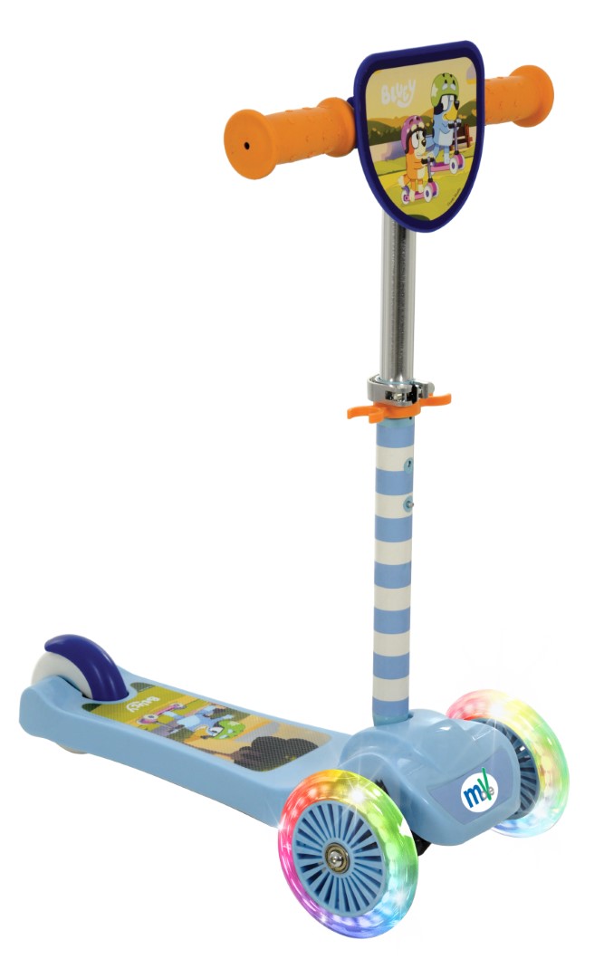 Tag med Bluey på en episk rejse med Mini Go! Løbehjul med lys! Dette fantastiske trehjulede løbehjul er din billet til eventyr perfekt til de mindste, der er ved at lære koordination og balance. Kør med stil takket være de funklende, flerfarvede lysende