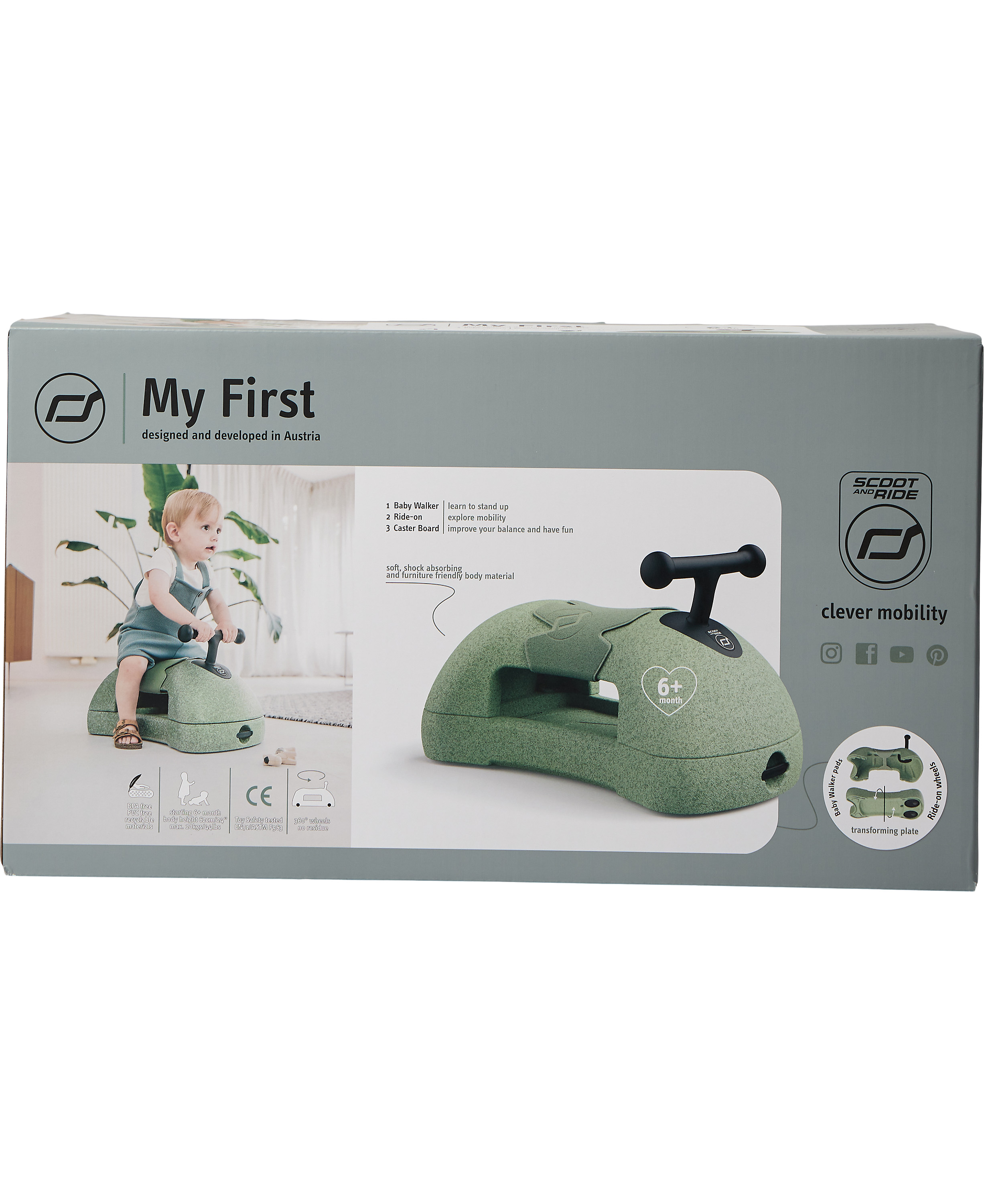 Min første er din babys første 3 i 1 baby walker & Ride-on kombination. Fremstillet af blødt, stødabsorberende EPP-materiale, genanvendeligt og sikkert for brugere og møbler.My First er et meget innovativt produkt med 3 funktioner. Først og fremmest en Ba
