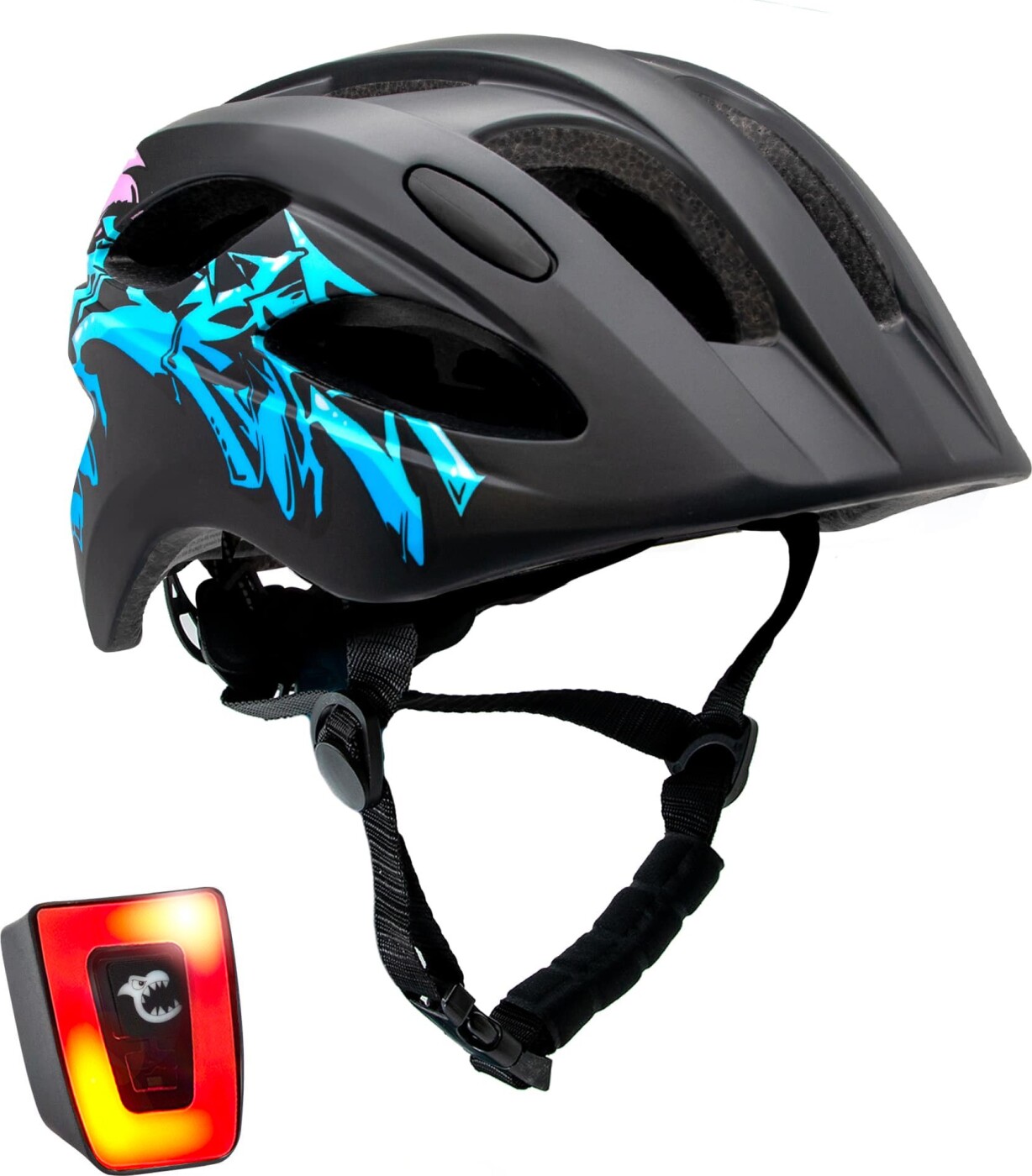 Crazy Safety cykelhjelm til børn kombinerer sikkerhed og stil på en unik måde. Denne hjelm er designet med et iøjnefaldende sort og blå graffiti-motiv, som vil glæde enhver lille cyklist. Hjelmen er ideel til børn, der ønsker at se cool ud, mens de cykler sikkert.