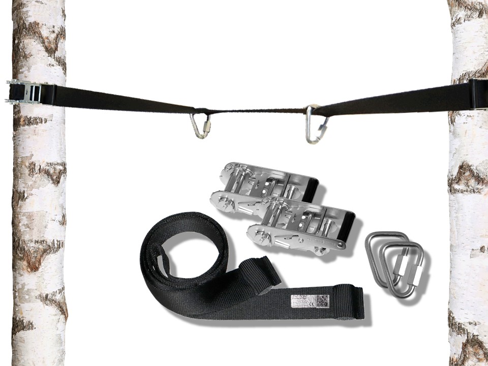 Hængekøjer og gynger er geniale både til afslapning og leg. At hænge dem op kan være lidt mindre morsomt og nogle gange kræve en mindre maskinpark og mere end ti tommelfingre. Nu har vi den glædelige nyhed, at hængekøje- og gyngeophæng i træer fra nu af ikke behøver tage mere end 5 minutter. Selv følsomme træer, som du helst ikke vil ødelægge barken på, kan du nu hænge en hængekøje i. Det kræver kun en svensknøgle til skruen og bolten. Du skal ikke bore, og du skal heller ikke være nervøs for, om ophænget nu holder. Dette ophæng er nemlig lige til at tage ud af pakken, føre rundt om to træstammer, fastgøre stropperne i spænderne, og så er der hængekøjehygge eller en gyngetur.Karabinhagerne er ultrastærke, så det eneste, du skal være sikker på, er at træstammen eller grenen er stærk nok til at bære belastningen. Der er to karabinhager og to spænder med i pakken, nok til en hængekøje eller en gynge ophængt på tværs mellem to træer. Hvis du vil hænge flere hængekøjer op i samme line/strop, så skal du blot tilkøbe flere karabinhager.Tag ophænget med i skoven, hvis I vil have mulighed for en lur i hængekøjen på farten. Skal I hænge en gynge op, så skal den hænges på tværs mellem træerne og gynge på den anden led.Kan bære en elefant, hvis der skulle være sådan en i jeres have, og hvis den skulle have lyst til en gynge tur. Op til 2000 kg kan dette ophæng klare.Ingen syninger, alt er vævet sammen. UV- og vejrbestandigt.Denne variant har en line på 400 cm.