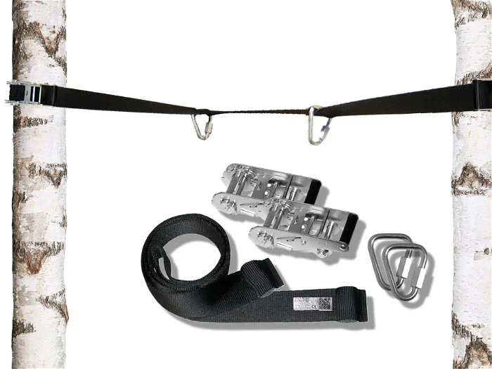 Hængekøjer og gynger er geniale både til afslapning og leg. At hænge dem op kan være lidt mindre morsomt. Nogle gange kan det nærmest kræve en mindre maskinpart og mere end 10 tommelfingre. Her har vi den skønne nyhed, at hængekøje- og gyngeophæng i træer fra nu af ikke behøver tage mere end 5 minutter. Selv følsomme træer, som du helst ikke vil ødelægge barken på, kan du nu hænge en hængekøje i. Det kræver kun en svensknøgle til skruen og bolten. Du skal ikke bore, og du skal heller ikke være nervøs for, om ophænget nu holder. Dette ophæng er nemlig lige til at tage ud af pakken, føre rundt om to træstammer, fastgøre stropperne i spænderne, og så er der hængekøjehygge eller en gyngetur.Karabinhagerne er ultrastærke, så det eneste, du skal være sikker på, er at træstammen eller grenen er stærk nok til at bære belastningen. Der er to karabinhager og to spænder med i pakken, nok til en hængekøje eller en gynge ophængt på tværs mellem to træer. Hvis du vil hænge flere hængekøjer op i samme line/strop, så skal du blot tilkøbe flere karabinhager.Tag ophænget med i skoven, hvis I vil have mulighed for en lur i hængekøjen på farten. Skal I hænge en gynge op, så skal den hænges på tværs mellem træerne og gynge på den anden led.Kan bære en elefantunge, hvis der skulle være sådan en i jeres have, og hvis den skulle have lyst til en gynge tur. Op til 2000 kg kan dette ophæng klare.Ingen syninger, alt er vævet sammen. UV- og vejrbestandigt.Denne variant har en line på 600 cm.