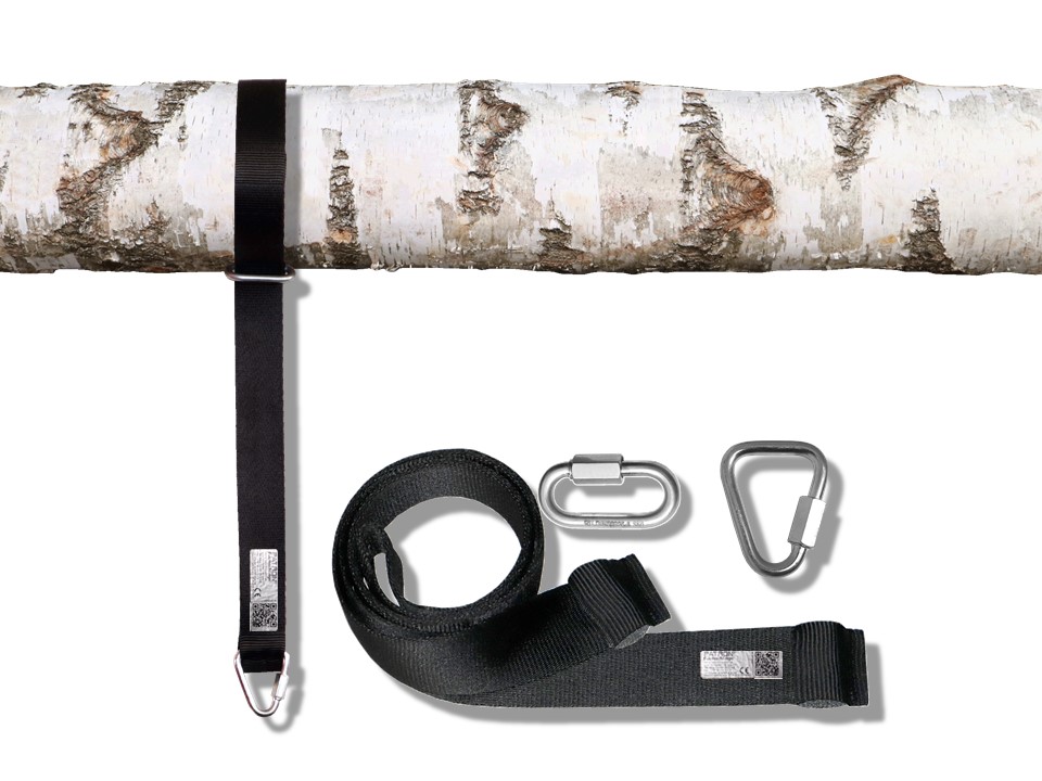 Gynger, hængekøjer, romerringe, sansegynger og trapez'er er geniale både til afslapning og leg. At hænge dem op kan være lidt mindre morsomt og nogle gange kræve en mindre maskinpark og mere en ti tommelfingre. Nu har vi den glædelige nyhed, at gyngeophæng i træer fra nu af ikke behøver tage mere end 5 minutter. Selv følsomme træer, som du helst ikke vil ødelægge barken på, kan du nu hænge en gynge, en hængekøjestol eller andre hængende former for indretninger på i. Det kræver ikke værktøj, du skal ikke bore, og du skal heller ikke være nervøs for, om ophænget nu holder. Dette ophæng er nemlig lige til at tage ud af pakken, føre rundt om en træstamme, føre stroppen ind i ringen, og så er der gyngetur. Karabinhagen er ultrastærk, så det eneste, du skal være sikker på, er at træstammen eller grenen er stærk nok til at bære belastningen. Før en gang rundt for en enkel ophængning, to gange for et ophæng, der ikke kan skride og tre gange, hvis du vil skåne træstammen. Tag ophænget med i skoven, hvis I vil have mulighed for en gyngetur på farten. Brug ophænget til nemt ophæng af gynger, trapez'er eller andre svingende legesager i træer eller runde pæle.Kan bære en elefant, hvis der skulle være sådan en i jeres have, og hvis den skulle have lyst til en gynge tur. Op til 2000 kg kan dette ophæng klare.Ingen syninger, alt er vævet sammen. UV- og vejrbestandigt.Der er 1 stk i pakken, så til de fleste gynger og lignende skal du bruge to stk. Denne variant har en line på 100 cm.