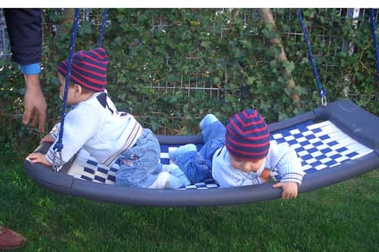 Denne sansegynge er aktuel for baby, vuggestuebarnet, dit barn i børnehave, og såmænd også for tweenies, teenagere, voksne og ældre.Gyngen vil både være et hit i private hjem (da det er alle i familien der kan bruge den), i institutioner og f.eks. i gymnastiksale. Den kan både nydes som rekreation og afslapning og for fulde gardiner når der sættes gang i den.Denne flerbørns sansegynge kan bruges både udenfor og indenfor.Den er udformet i en stabil letvægtskonstruktion, men kan alligevel tage op til 150 kg.Det vil sige at der både kan sidde flere børn på den eller et eller to børn og en voksen. Helt fra fødslen og til voksenalderen er denne gynge bare skøn.Obs: Vi gør opmærksom på at liggenettet leveres usamlet, man skal således selv flette det. Det er heldigvis ret ligetil og der følger samlevejledning med på dansk.Der følger babysele med gyngen.Nettet kan skilles ad for rengøring og kan hånd- eller maskinvaskes op til 30 grader.Sikkerhed:Der skal være en afstand på ca. 2 meter både forud og bagved gyngen udover gyngens maksimale svingområde samt et plant blødt underlag uden forhindringer.Der skal være 80 cm luft på begge sider af gyngen sideværts.Gyngen skal når den hænger stille, være 40 cm over jorden.Der må ikke være hårde, spidse eller skarpe genstande i gyngeområdet.Gyngen leveres med 4 stk. tove og S-hager så gyngehøjden kan justeres. Ophængingsstedet kan max være 3 meter i højden.Hvis du bruger gyngen udenfor anbefales det at tage gyngen indenfor ved kraftig regn og ved frost. Det forlænger levetiden.Sættet indeholder:1 x Babysele1 x pakke bånd i plastpose2 x aluminiumsrør, lange og bøjede2 x aluminiumsrør korte og bøjede2 x stødbeskyttere til top og bundstykke1 x plastpose med monteringsmateriale bestående af 2 x ringeMål samlet : 136 x 66 cm.Du kan købe sikkerhedsgodkendte ophæng her. Denne gynge kræver to stk.