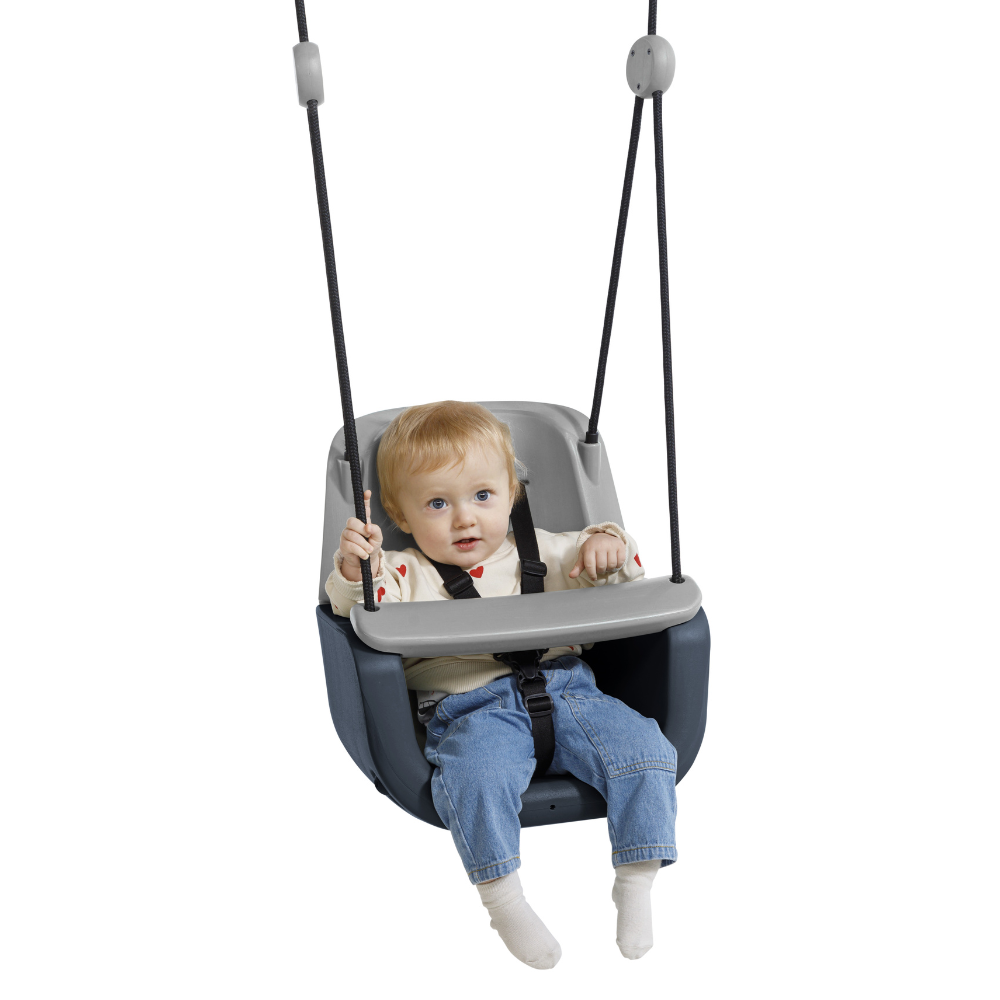 Sikkerhed frem for alt er det, der gælder, når dit barn skal tage sine første gyngeture. Denne babygynge er top solid, og så har den 3 forskellige måder at være på alt efter, hvad dit barn er klar til. Spænd dit barn fast i gyngen med fast ryg og 3-punkt sele, der sikrer at dit barn sidder solidt og trygt med ryggen tæt op af ryglænet.Lad barren sidde, så dit barn har et sted at holde fast. Eller tag barren af, så dit barn ikke har den foran sig. Og så kan du også tage det øverste af ryggen af, så dit barns kernemuskulatur skal mere på arbejde. Rebet er 140-190 cm langt, og der er en ring øverst. Kan bære op til 70 kg, så den skal nok holde.