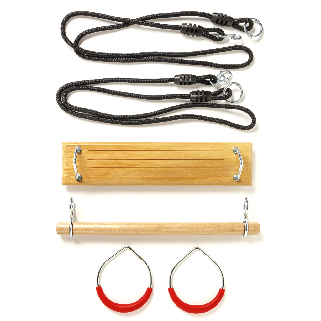 Kan ungerne ikke beslutte sig for om det er sjovest med gynge, gymnastikringe eller trapez. Her får du alle tre dele at skifte mellem. Det er jo oplagt at genbruge rebet, hvis der alligevel ikke er plads på gyngestativet eller i træet til mere end én ting.Specifikationer:Trapezstang og gynge af hårdt træ behandlet med et kobberbaseret produktBehandlet og godkendt til udendørs brug - ikke til brug indendørsSlidstærke, sorte, bløde flettede reb som holder til vind og regnSorte plastsvejsninger på rebeneRinge af galvaniseret stålReblængde: 190 cm.Dejlig gave til en krudtugle, gymnast eller cirkusartist du kender.