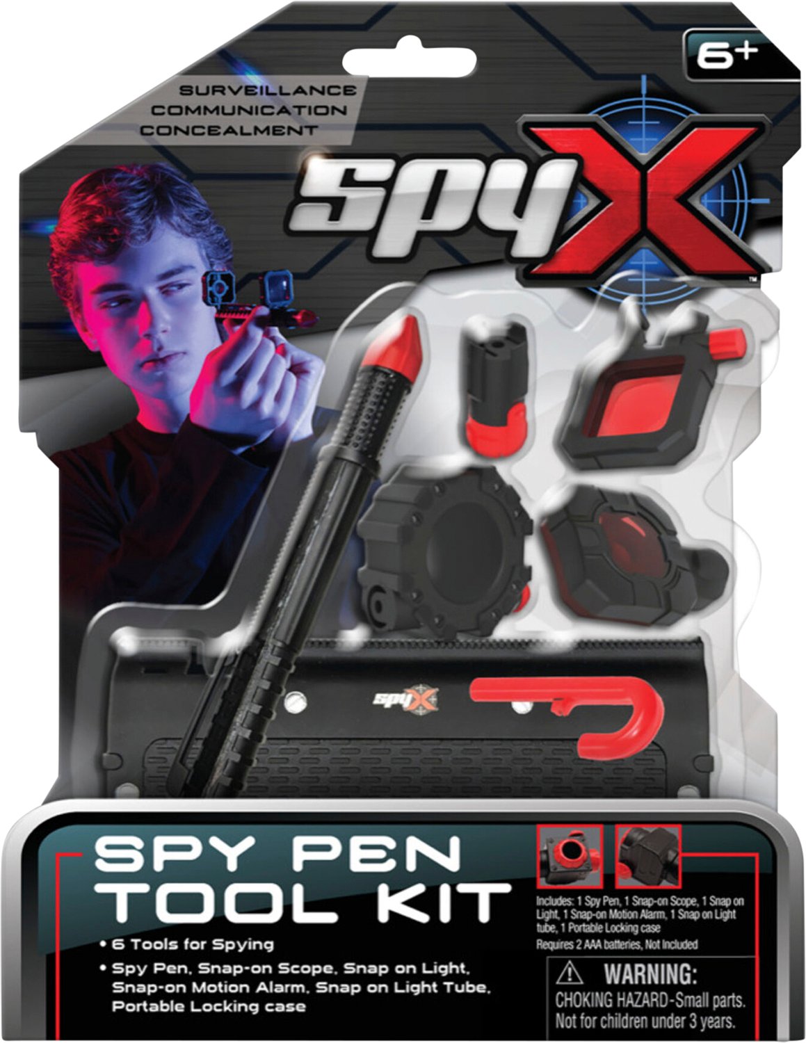 SpyX 6-i-1 Spionudstyrssæt Dette er ingen almindelig kuglepenssæt Det er et rigtigt tophemmeligt spionsæt De 6 værktøjer i spionsættet hjælper dig som agent med at udføre tophemmelige missioner 6 år Funktioner: Sikkerhed: En lysfølsom bevægelsesalarm, som