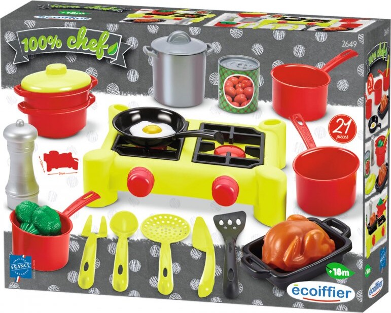 Nu kan børnene være kreative og udfolde sig som kokke! Her får du et køkkensæt af 21 dele, der har alt det udstyr, man skal bruge for at lave mad; komfur, pande, gryder, kasseroller, kniv, si,...
