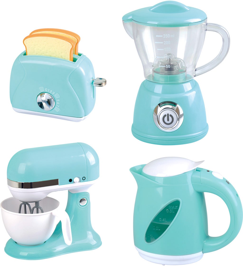 Køkkenredskabssæt fra Cloudberry Castle med fire køkkenmaskiner i flotte farver. Perfekt til timevis af fantasifuld leg. - Indeholder: 1 brødrister, 1 blender, 1 røremaskine, 1 kedel. - 4 dele. - Realistiske lydeffekter. - Brødrister: 15x7x13 cm. - Blender: 14 x 9 x 8 cm. - Bagemaskine: 10 x 10 x 8 cm. - Kedel: 16 x 9 x 16 cm. - Farverigt design. - CE-mærket. - Anbefalet alder: Fra 3 år. - Plastik. - Batterier medfølger ikke.