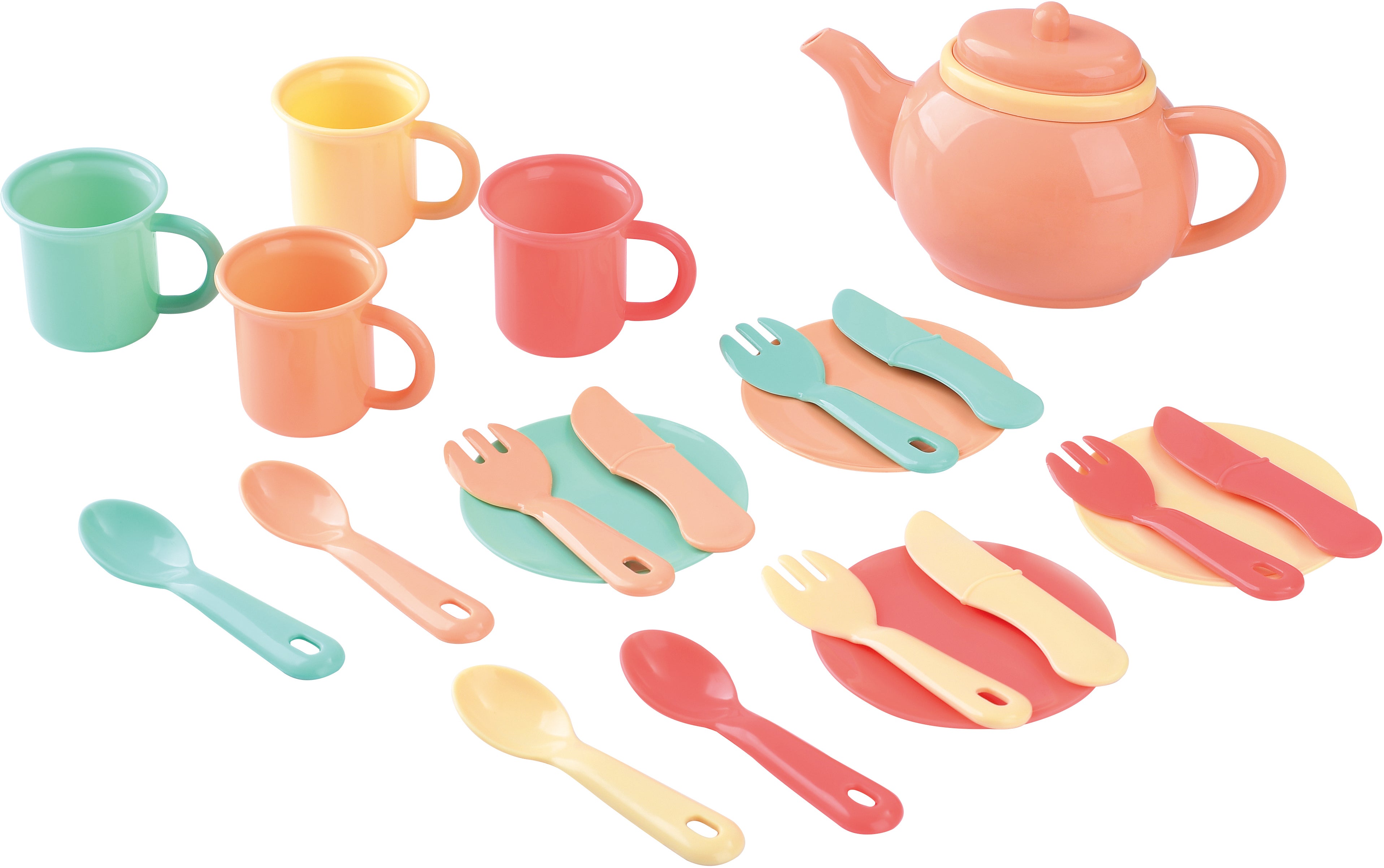 Tesæt fra Cloudberry Castle i flotte farver. Perfekt til timevis af fantasifuld leg. - Indeholder: 1 tepotte, 4 tekopper, 4 små tallerkener, 4 skeer, 4 gafler, 4 knive. - 22 dele. - Farverigt design. - CE-mærket. - Anbefalet alder: Fra 2 år. - Genanvendt plastik.