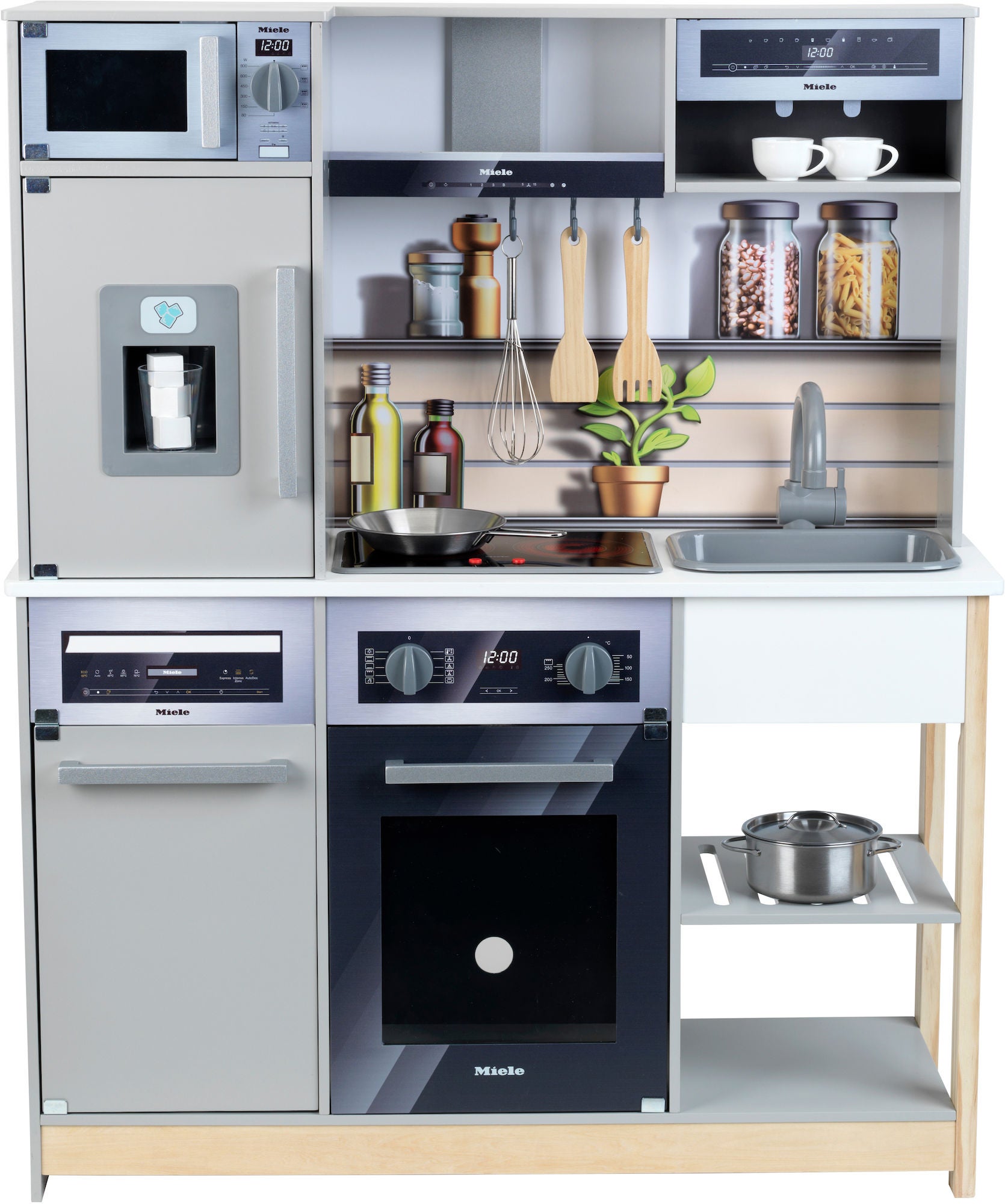 Et fint legekøkken i træ fra Miele. Dette legekøkken i miniformat er detaljeret og virkeligstro. Her kan børnene lege mesterkokke! Køkkenet er udstyret med et køleskab med ismaskine, komfur, ovn, mikroovn og en aftagelig håndvask. Kogepladerne har lyd- og lysfunktion. Sammen med køkkenet får du også fint tilbehør af træ og metal gryde med låg, kasserolle, pisk og grydeske. Dette legekøkken er FSC-certificeret. Ikke egnet til børn under tre år på grund af små dele. Anbefalet alder: Fra 3 år