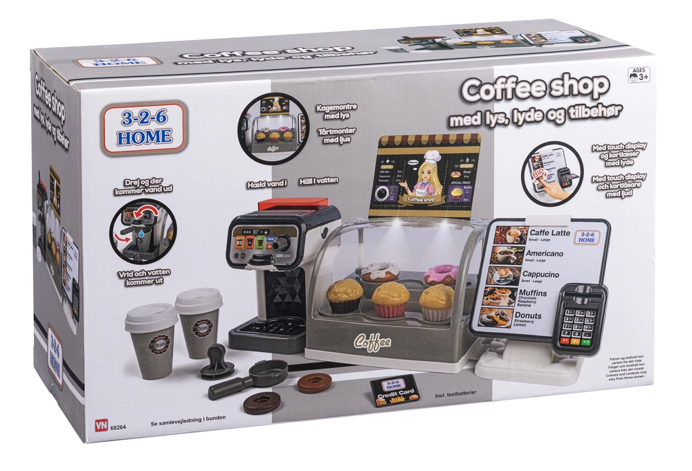 Coffee shop med lys, lyde og tilbehør Med touchskærm og kortlæser med lyde, kagemontre med lys, espressomaskine med tilbehør, muffins og donuts, kreditkort og 2 drikkekopper med låg. Inkl. 2 stk. AAA-batterier og 3 stk. knapcellebatterier.