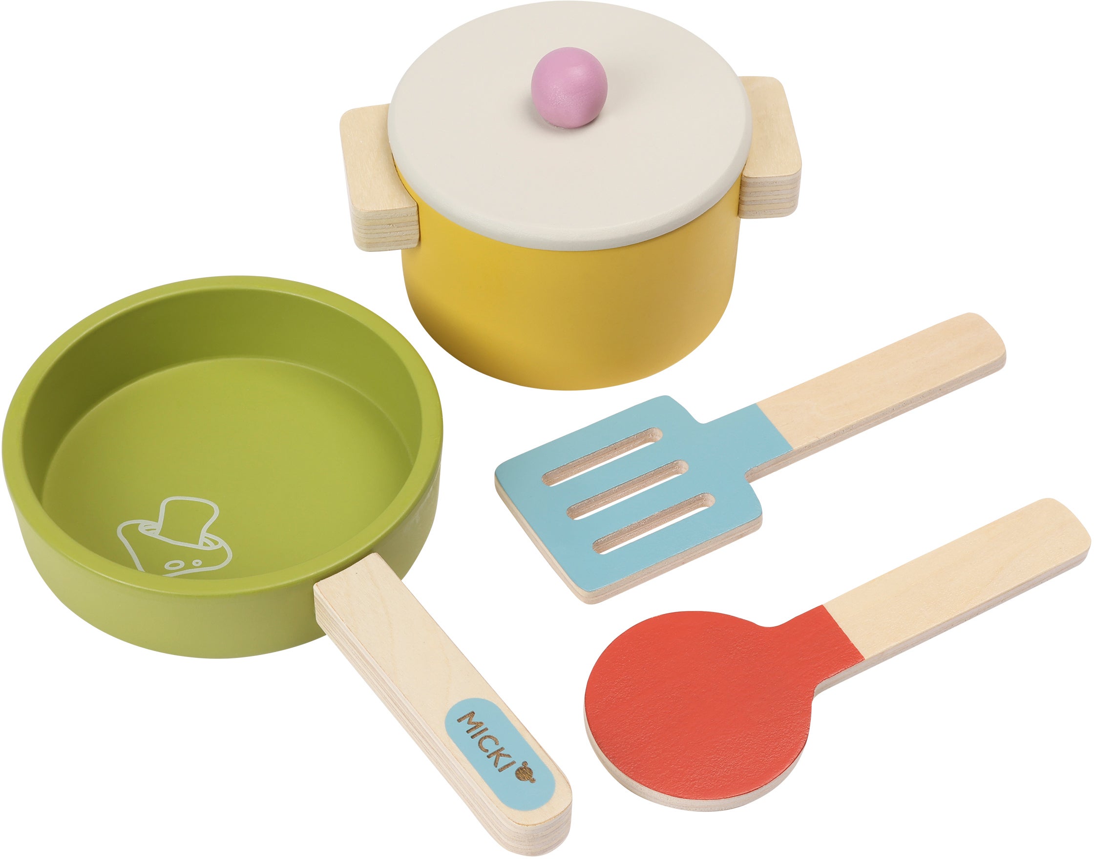 Fint køkkensæt fra Micki. Perfekt til timevis af fantasifuld leg. - Indeholder: 1 gryde, 1 stegepande, 1 ske, 1 paletkniv. - Klassisk design. - Legende motiver. - CE-mærket. - Anbefalet alder: Fra 3 år. - FSC-certificeret træ.