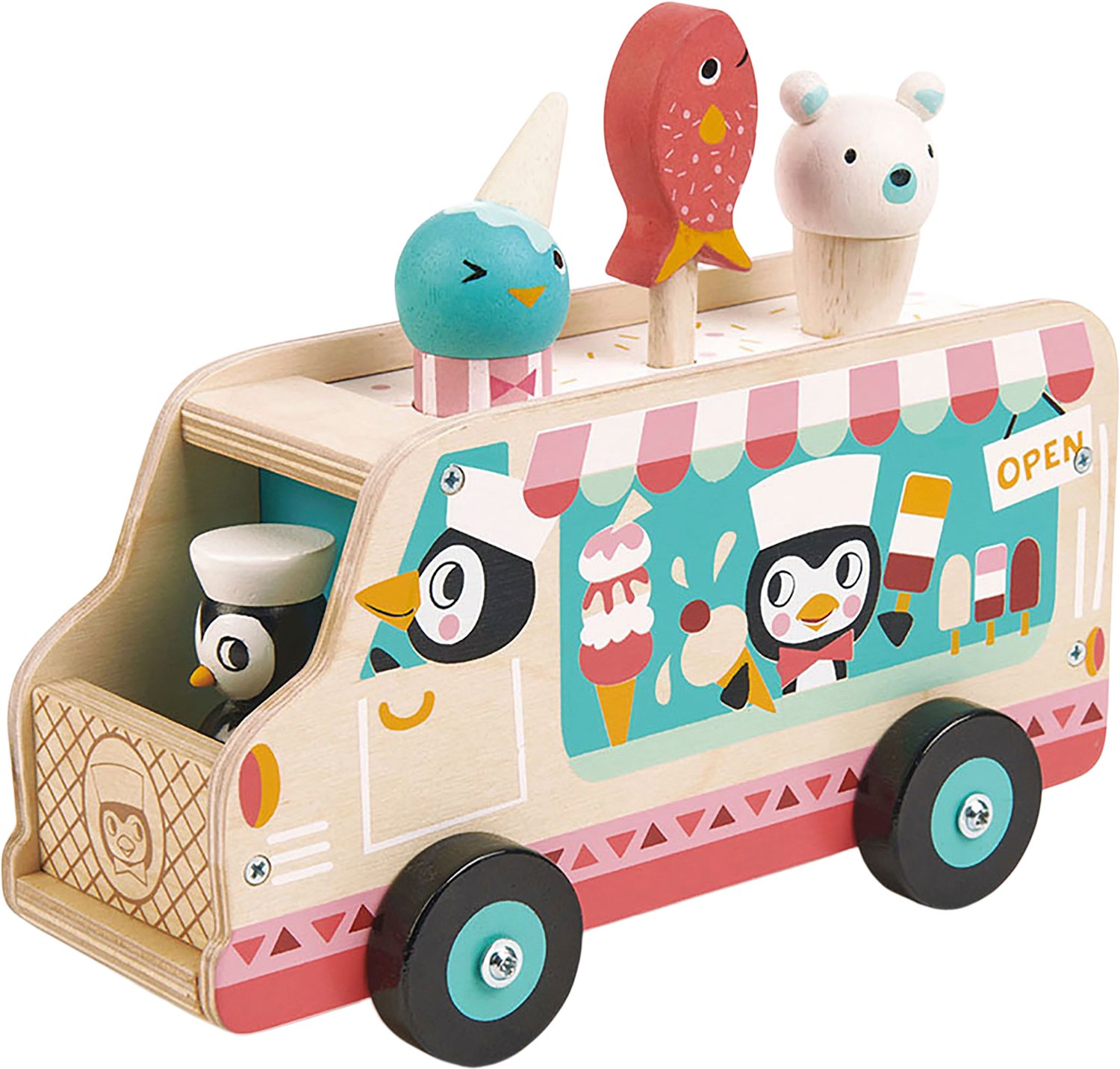 Finurlig isbil med en fræk pingvinchauffør. Aftageligt tag afslører et lastrum til is. De 3 sjove is kan sættes på taget: En fiskeformet ispind, en isbjørn snow cone og en skør, blå is!Materiale: TræProdukt: 21,7 x 10 x 17,3 cmEmballage: 23,5 x 11,4 x 13,