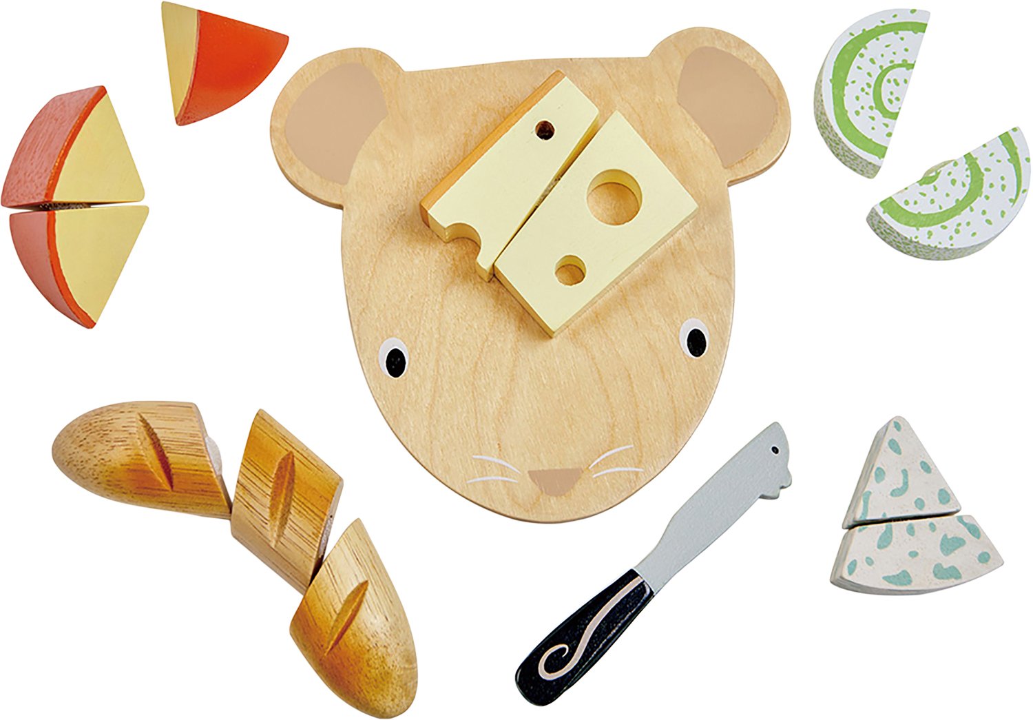 Et museformet ostebræt af træ med en muse-ostekniv. Et baguette i 3 dele, en Eidammerost i 3 dele, en Gruyere, en Rouleau og en blåskimmelost i 2 dele. Velcro gør det let, at skære osten over og samle den igen. Opbevaringsnet medfølger. Materiale: TræProd