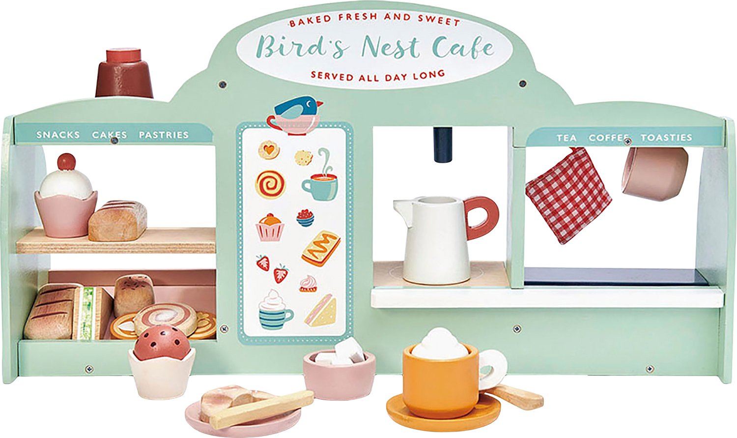 Kaffebar legecafé med masser af tilbehør, der inviterer til kreativ leg for 2 eller flere børn. Her kan børnene lege, at brygge en kop te eller en cappucino ved hjælp af forskellige kapsler, servere en panini, sandwich eller bagværk. 40 stykker tilbehør e