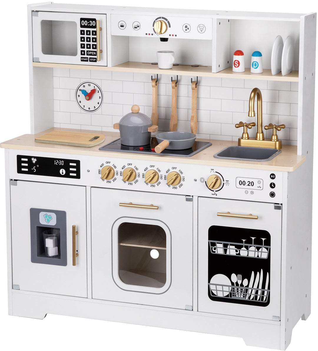 Fint legekøkken fra Tooky Toy med et klassisk design. Det har en realistisk funktion. Perfekt til timevis af fantasifuld leg. - Indeholder: 1 legekøkken, 1 gryde, 1 stegepande, 2 grydeskeer, 1 paletkniv, 1 skærebræt, 1 skål, 1 salatskål, 1 peberkværn, 1 kaffekop, 1 glas. - Sættet har en vask med en drejbar vandhane, ovn, emhætte, komfur, opvaskemaskine, kaffemaskine, ismaskine og mikroovn. - Moderne og tidløst design. - Rengøres på overfladen med en fugtig klud. - Lyd- og lyseffekter. - Dele, der kan åbnes. - Stimulerer fantasi og finmotorik. - Mål: H 54 x B 14 x L 96 cm. - CE-mærket. - Anbefalet alder: Fra 3 år. - MDF, lindekrydsfiner, plastik.