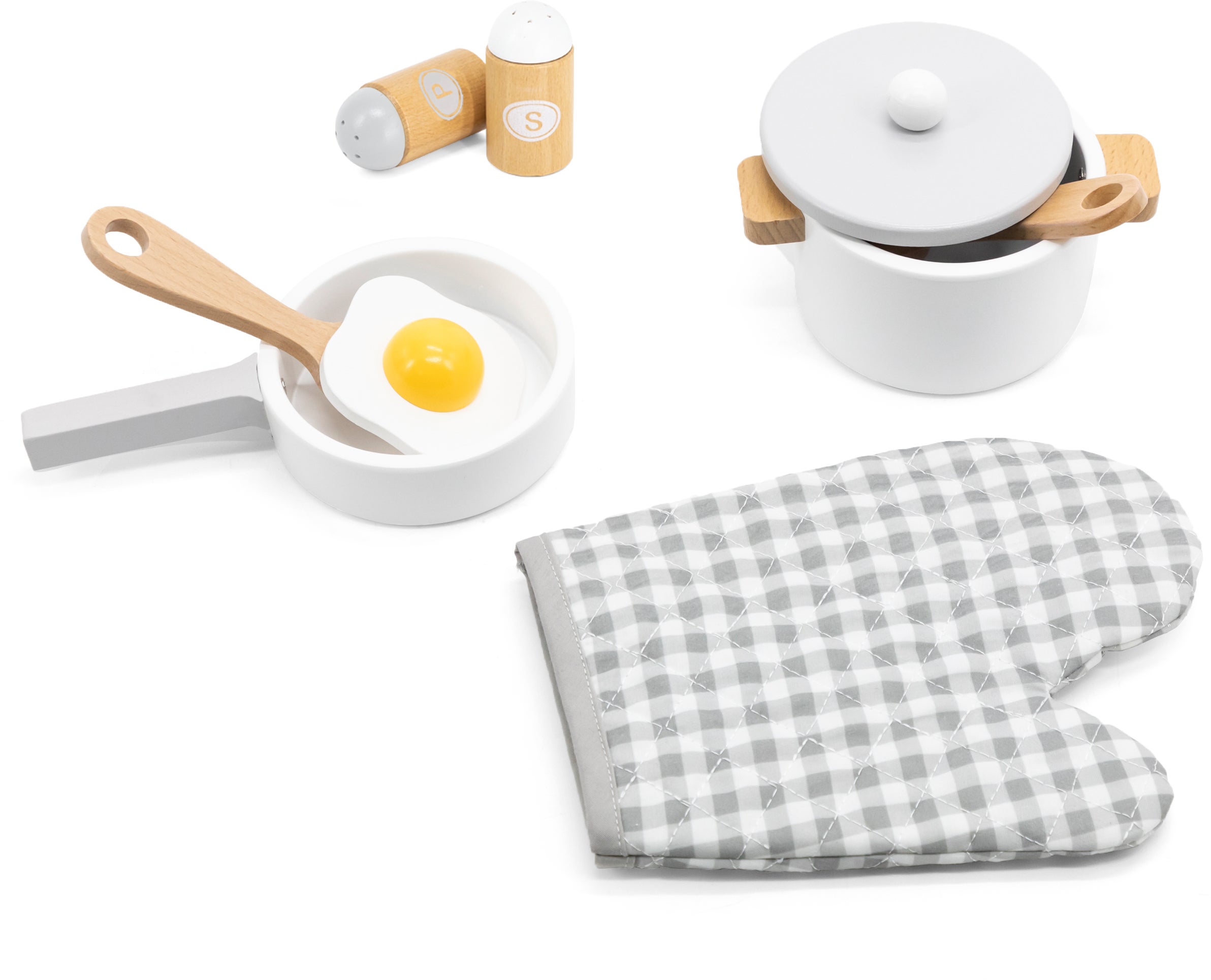 Madlavningssæt fra VIGA med en masse forskelligt tilbehør, som kan kombineres på mange kreative måder. Det har et detaljeret design i flotte farver. Perfekt til timevis af fantasifuld leg. - Indeholder: 1 kasserolle, 1 stegepande, 1 æg, 1 salatskål, 1 peberkværn, 1 ske, 1 grydevante. - Opmuntrer til sjov rolleleg. - Stimulerer fantasi og finmotorik. - Let at rengøre med en fugtig klud. - CE-mærket. - Anbefalet alder: Fra 3 år. - Træ, bomuld.