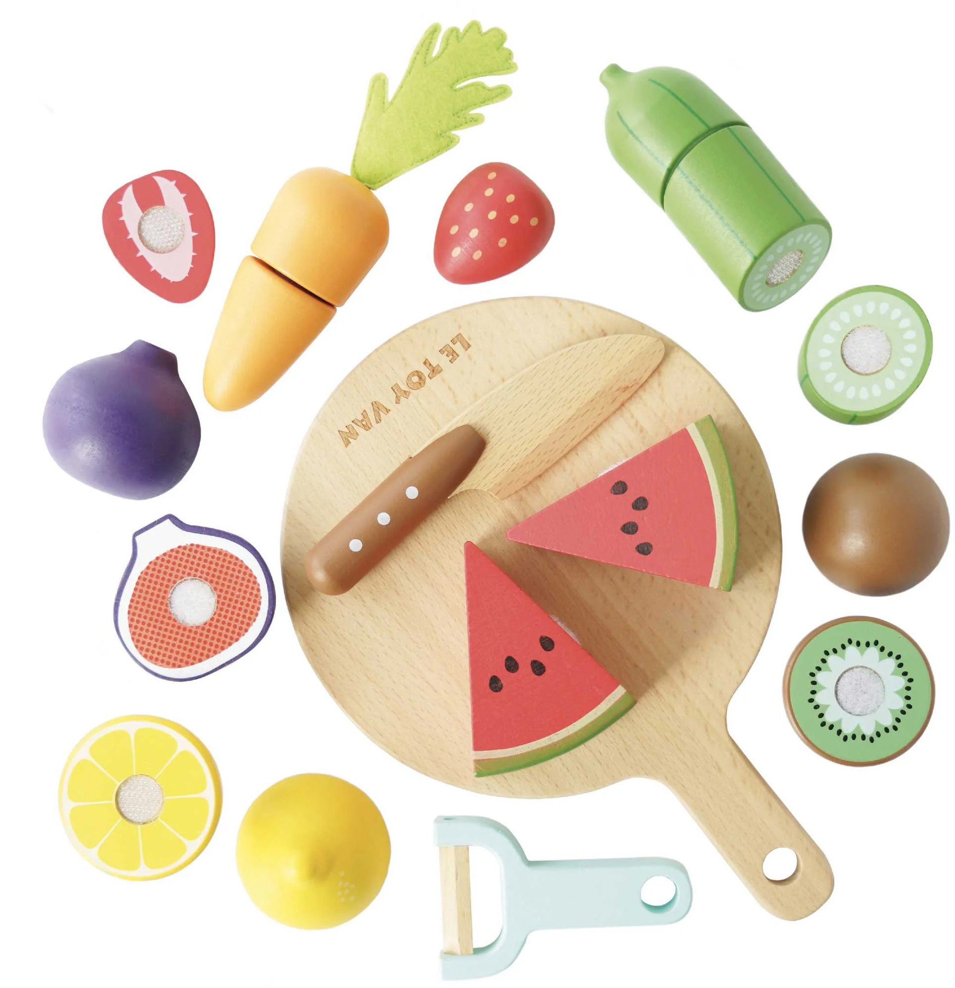 Skærebræt fra Le Toy Van med et børnevenligt design i flotte farver. Den har mange forskellige frugter og grøntsager, som bliver holdt sammen med velcro. Perfekt til mange timers sjov. - Indeholder: 1 skærebræt, 1 legetøjskniv, 1 skræller, 7 tilbehør. - Holdes sammen med velcro, så de adskilles realistisk, når de skæres i skiver. - Masser af søde detaljer. - Udvikler kognitive og finmotoriske færdigheder. - Let at rengøre med en fugtig klud. - CE-mærket. - Anbefalet alder: Fra 3 år. - Bøgetræ, velcro.