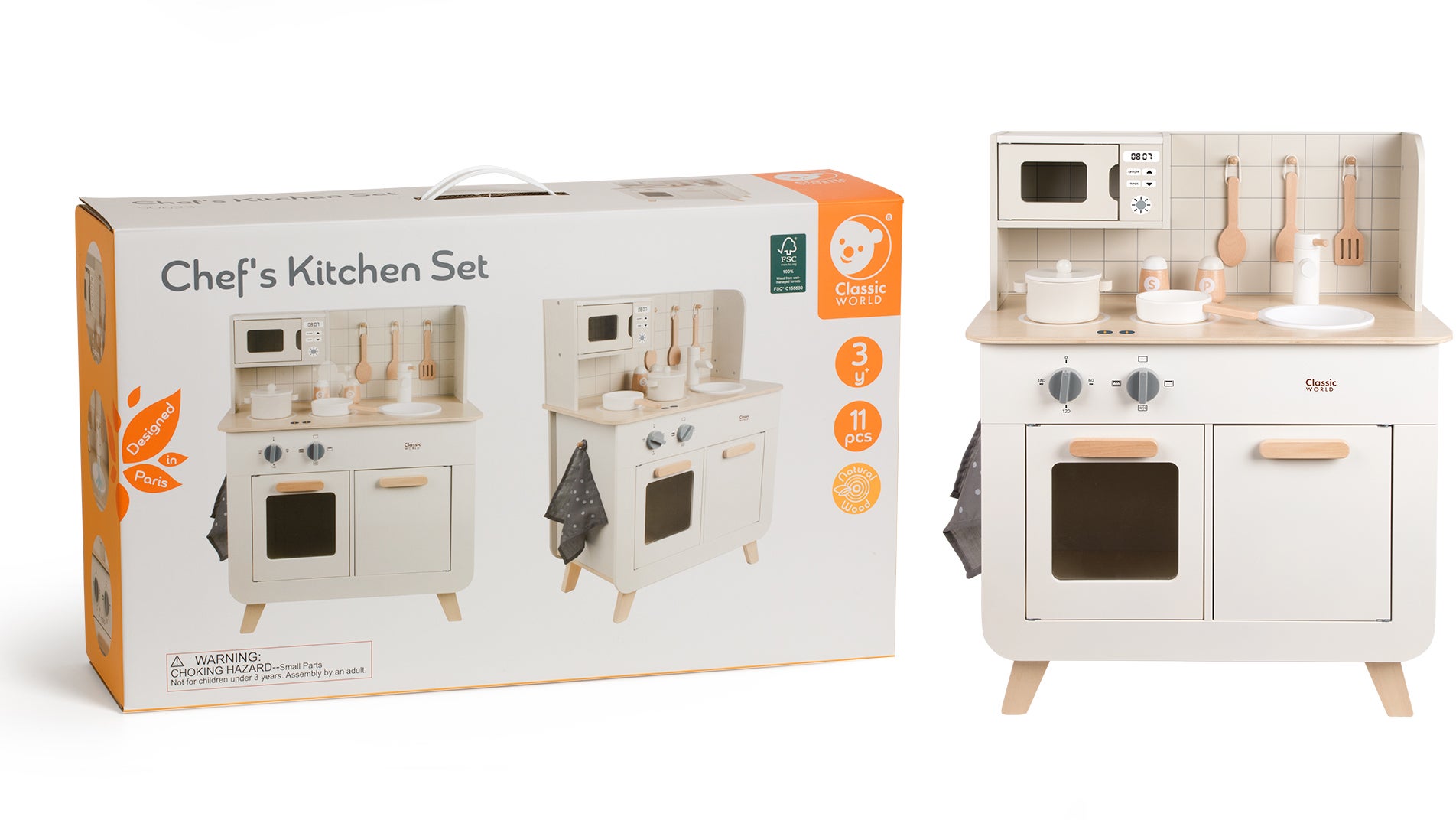 Køkkensæt fra Classic World med et klassisk design. Det har en realistisk funktion. Perfekt til timevis af fantasifuld leg. - Indeholder: 1 legekøkken, 1 dørslag, 3 paletknive, 1 salatskål, 1 peberkværn, 1 kasserolle, 1 stegepande. - Legekøkkenet har en vask, komfur, mikrobølgeovn, opvaskemaskine og ovn. - Moderne og tidløst design. - Rengøres på overfladen med en fugtig klud. - Dele, der kan åbnes. - Detaljeret design. - CE-mærket. - Anbefalet alder: Fra 3 år. - Træ.