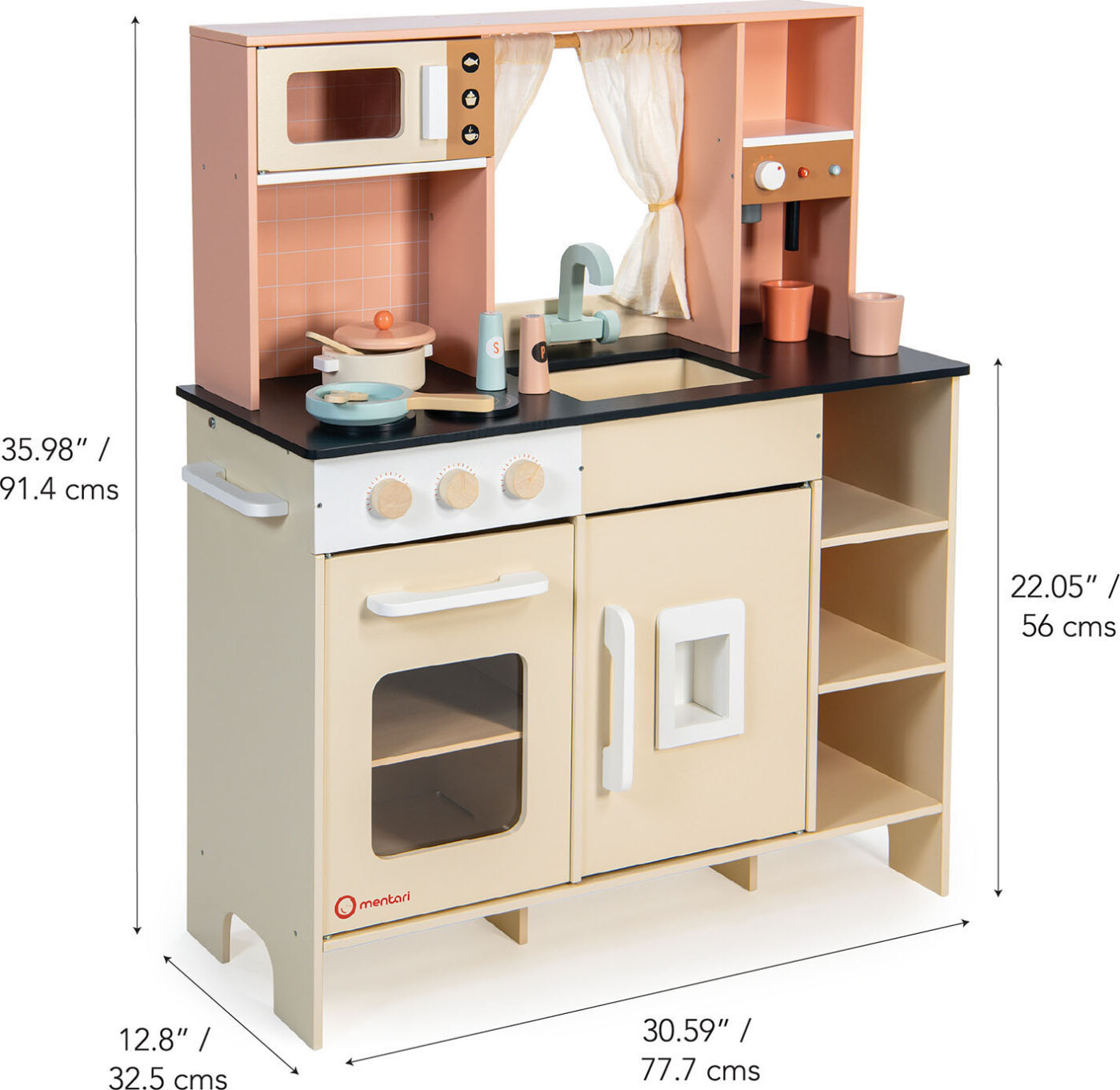 Mentari har designet dette legekøkken med øje for både funktion og leg. Det inkluderer bl.a.: