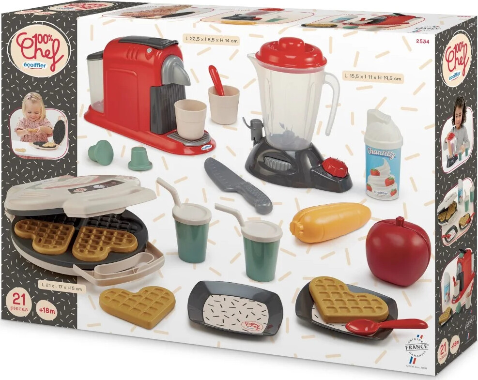 ECOIFFIER 100% Chef er en serie af legetøjskøkkenredskaber og -apparater til små mesterkokke. Dette legemad sæt med 21 dele giver børn mulighed for at lege kok og udforske madlavningens verden.