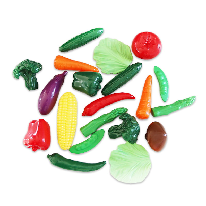 20 blandede legegrøntsager af plast som dit barn måske genkender fra ture i supermarkedet.