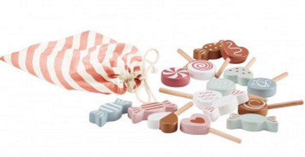 17 stykker lækkert slik i meget fin udformning. Det er godt nok af træ, en så holder det til gengæld til meget mere leg end fredagsslikket.Her er 10 slikpinde og 7 bolcher i en fin stofpose, perfekt til dit barns kiosk eller legebutik.