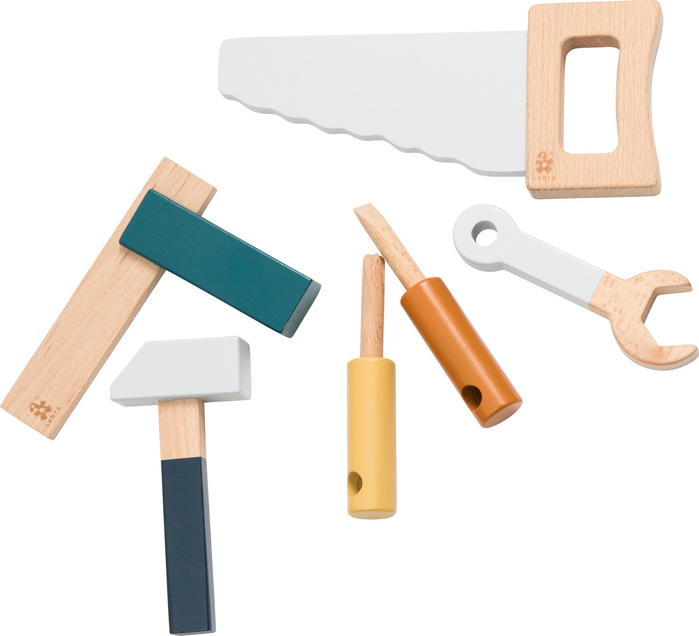 "Værktøjssæt i træ her i farven """"jetty grey"""".Leg byggemand eller -kvinde med dit barn med dette skønne værktøjssæt med seks dele i træ fra Sebra. Sættet opfordrer til kreativitet og fantasi, imens det hjæ