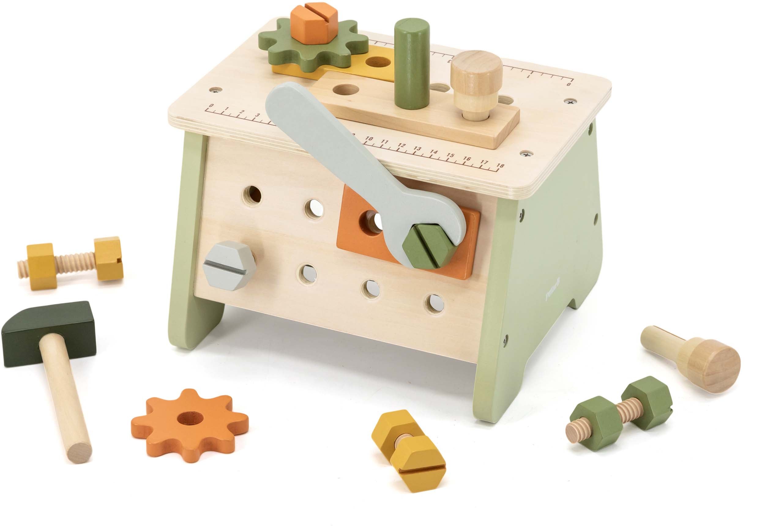 Værktøjskasse fra Polar B med mange sjove værktøjer. Perfekt til mange timers sjov. - Indeholder: 1 hammer, 1 skruetrækker, 1 skruenøgle, 3 tandhjul, 5 byggeklodser, 10 møtrikker. - 2-i-1. - Praktisk opbevaringskasse. - Vend værktøjskassen om, og det bliver til et arbejdsbord. - Kreativt byggelegetøj. - Lineal. - Farverigt design. - CE-mærket. - Anbefalet alder: Fra 3 år. - Træ, krydsfiner.