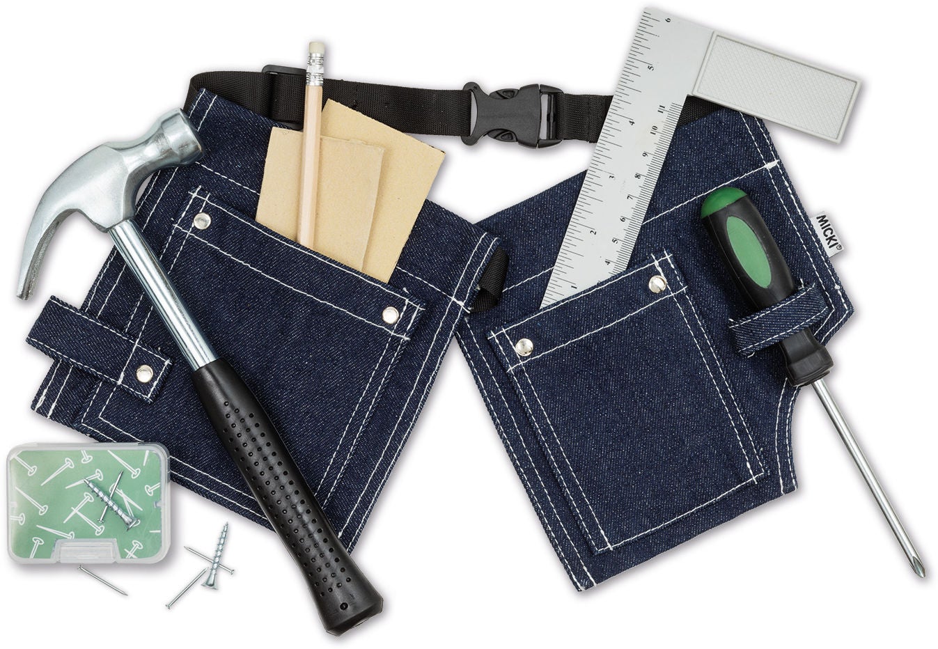 Et værktøjsbælte fra Micki med børneværktøj perfekt til alle de små tømrere! Bæltet er lavet af cowboy-stof og har lommer, der indeholder: søm, skruer oh værktøj. Man kan justere bæltet, så det altid sidder sikkert. Med bæltet får du: hammer, skruetrækker, vinkelmåler, blyant, sandpapir og en pakke med søm og skruer. Værktøjet er småt, så det kan bruges af små hænder. Anbefalet alder: Fra 3 år (taljemål: fra 51 64 cm.)