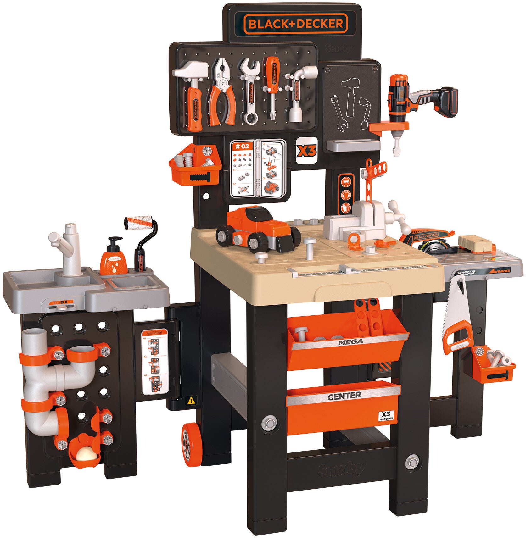 Værksted fra Smoby med et sjovt design med sjovt tilbehør. Det har en arbejdsbænk med et mekanisk bor, en cirkulær sav og seks forskellige værktøjer og en køkkenvask. Værkstedet har praktiske opbevaringskasser, to hjul og foldbare sider for enkel og problemfri transport. Perfekt til timevis af fantasifuld leg. CE-mærket. Anbefalet alder: Fra 3 år. Plastik, metal.