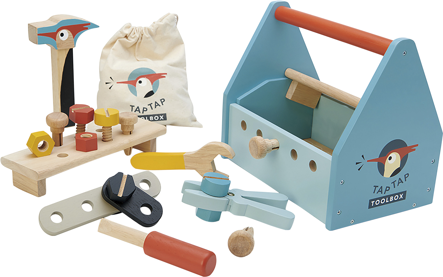 Værktøjskasse fyldt med alt, hvad den lille håndværker har brug for. Tavlen på den ene side af værktøjskassen, kan bruges til at nedskrive ideer til nye opfindelser. De to aftagelige låg bliver til plader, der kan skrues og hamres iAlle smådelene kan pakk
