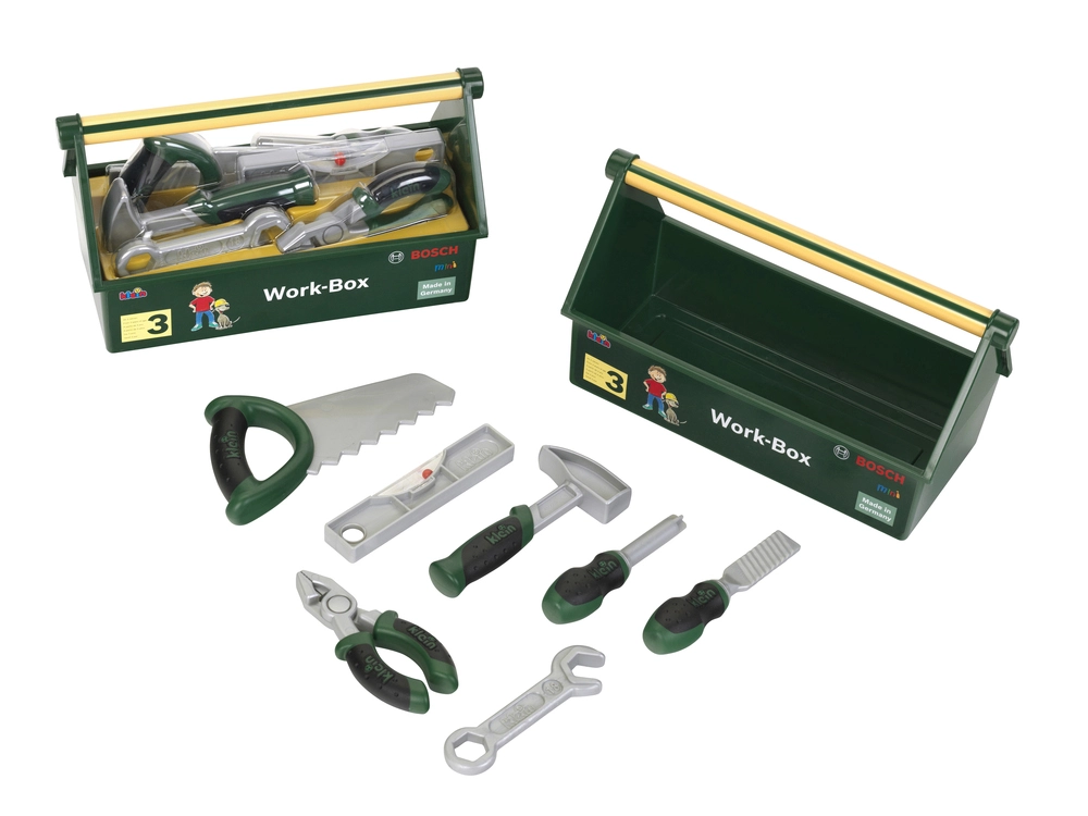 Kassen er fyldt med realistisk legetøjsværktøj, herunder hammer, sav, skruetrækker, skruenøgler og meget mere – alt sammen i Bosch-design, så det ligner det ægte værktøj. Værktøjet er børnevenligt og sikkert, og kassen gør det nemt at holde styr på alt udstyret.