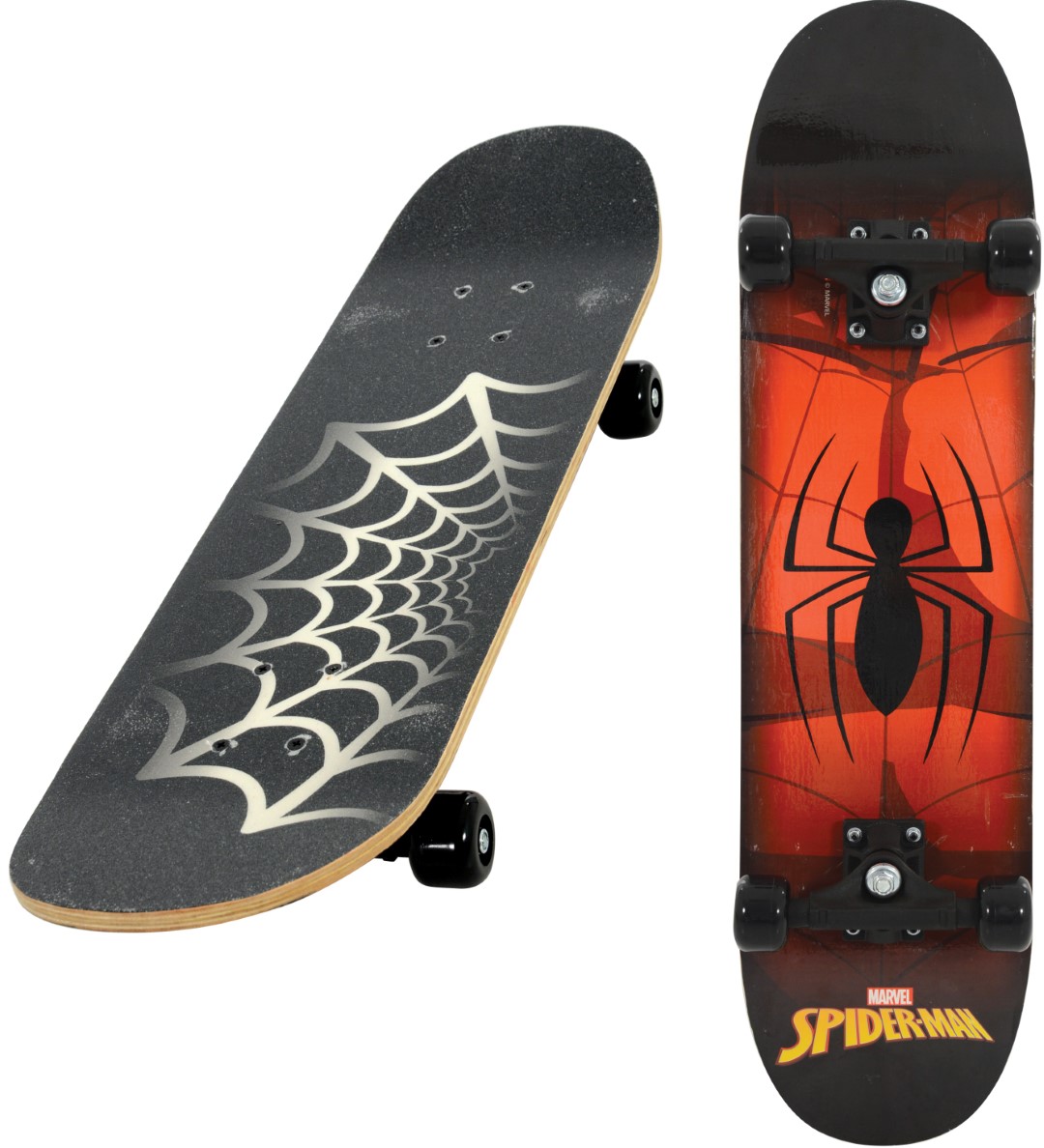 Sving dig ud i action med Spider-man-skateboardet! Dette skateboard er designet med et sejt dobbeltsidet karakterprint og vil få dig til at se godt ud på gaden. Det slidstærke 7-lags trædæk er bygget til holdbarhed og måler 79 x 20 cm med en dobbelt kickt