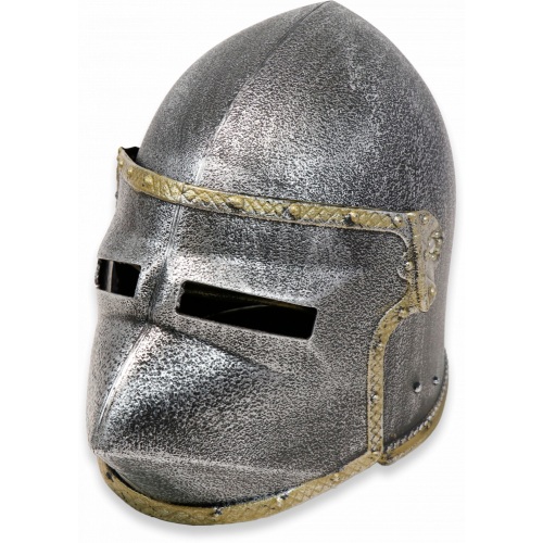 Børneridderhjelmen 'Bourbon Lily' med opklappeligt visir af syntetisk materiale er et fængslende legetøj, der tager børn med ind i middelalderens fascinerende verden. Hjelmen har en ru struktureret sølvoverflade og gyldne dekorationer, som giver d